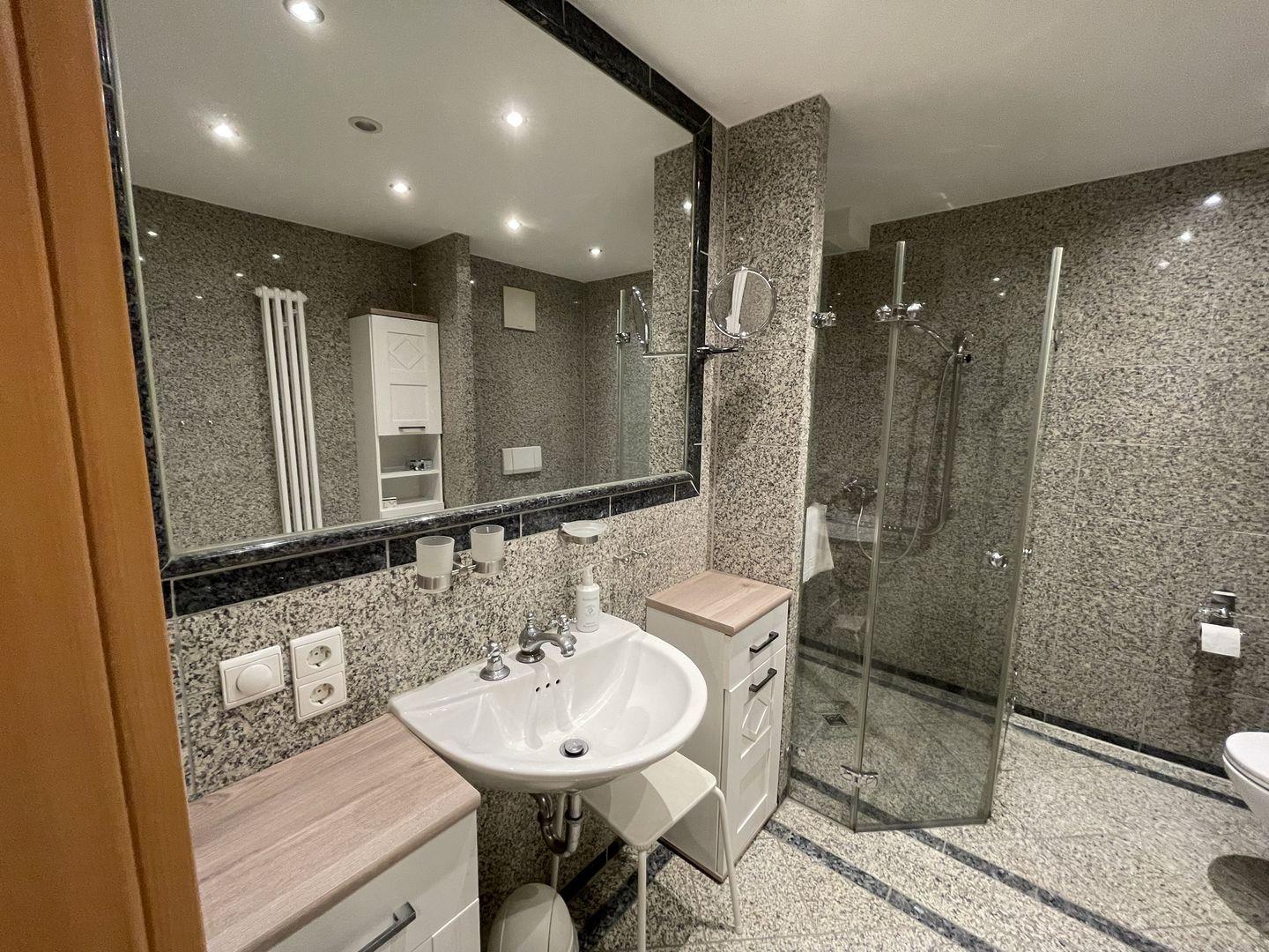 Diese geräumige Ferienwohnung lädt Sie zu einem Frühstück auf Ihrer privaten Terrasse ein. Der Wohnraum kombiniert eine voll ausgestattete Küchenzeile mit einem Essbereich und einem gemütlichen Wohnzimmer. Hier findet sich neben der Schlafcouch auch ein LCD-Flachbildfernseher, ein DVD-Player und eine Stereo-Anlage. Die Küche umfasst eine Back- und Kochmöglichkeit, einen Geschirrspüler, eine Mikrowelle, einen Wasserkocher, einen Toaster und eine Kaffeemaschine. Das Schlafzimmer liegt separat und verfügt über ein Doppelbett und ausreichend Stauraum. Das Badezimmer punktet mit einer geräumigen Dusche, einem Waschbecken, einem WC und einem großen Spiegel. Haustiere sind in dieser Wohnung herzlich willkommen. Zudem ist die Wohnung barrierearm und sehr gut für Rollstuhlfaher geeignet.