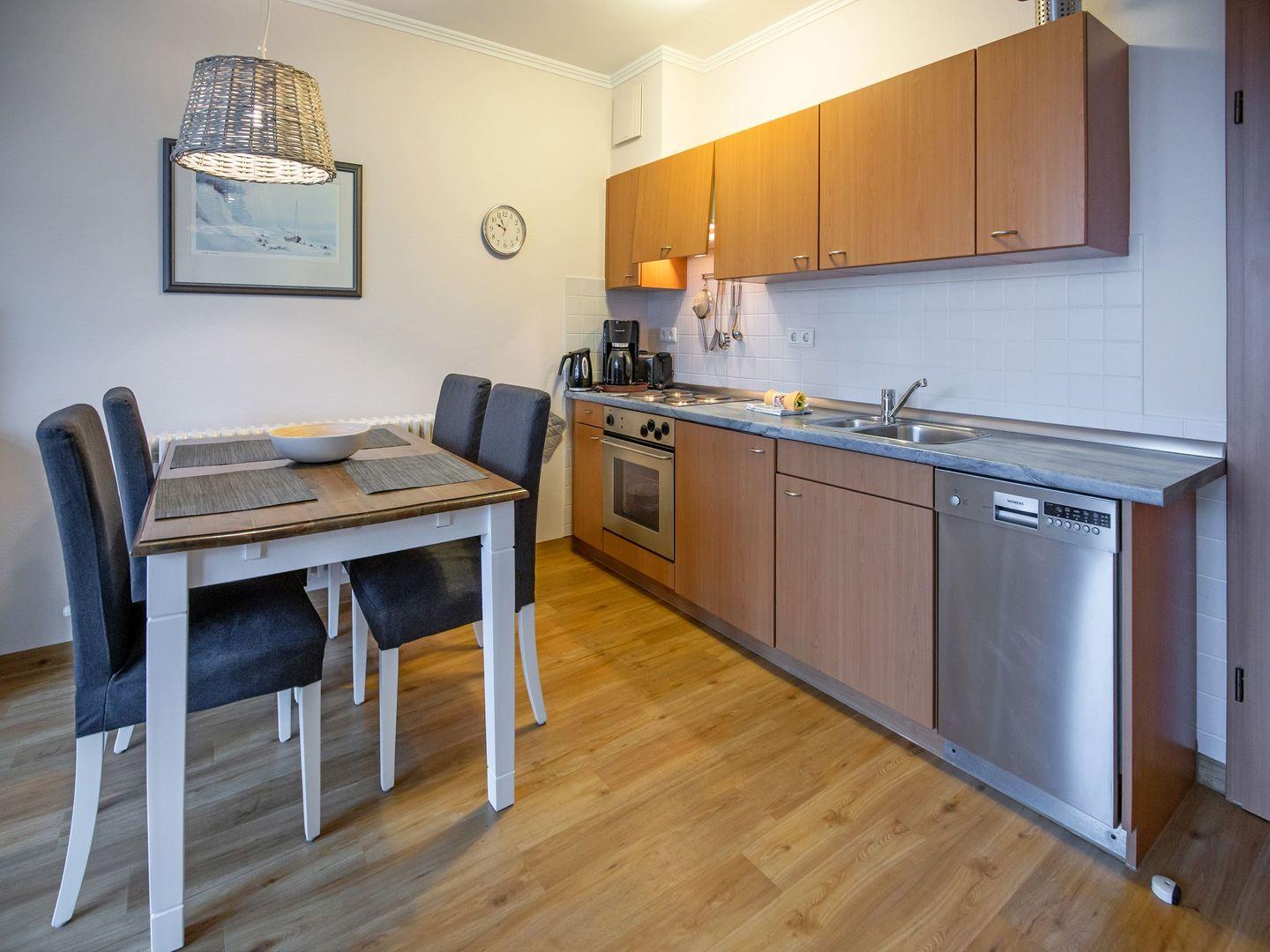 Wohnraum, separates Schlafzimmer, Balkon, eingerichtete Küchenzeile mit Geschirrspüler, Dusche/ WC, LCD-Flachbildschirm, DVD-Player, Stereo-Anlage, Haustiere nicht erlaubt, Nichtraucher, kein Safe vorhanden. In der Zeit von Mai bis September ist ein eigener Strandkorb am Strand gegen Aufpreis buchbar.