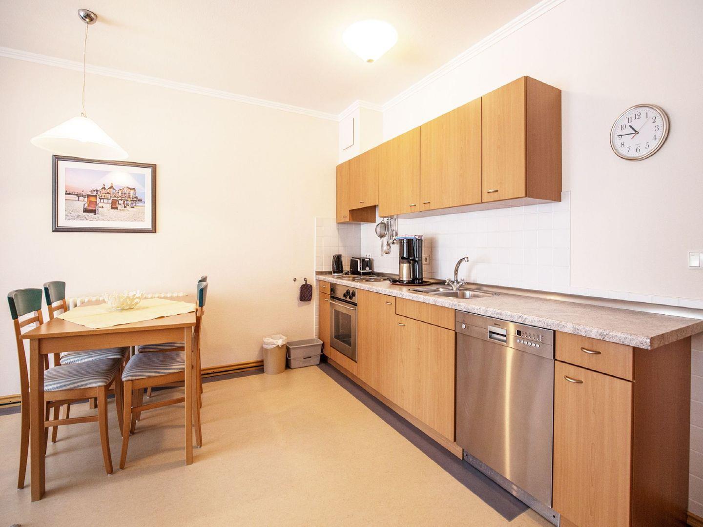 In dieser freundlichen Ferienwohnung genießen Sie das Frühstück auf Ihrem eigenen Balkon. Eine gut ausgestattete Wohnküche verbindet eine Küchenzeile mit einem Essbereich und einem Wohnzimmer. Das ausziehbare Sofa bietet eine zusätzliche Schlafmöglichkeit, außerdem finden sich hier ein 50 Zoll LCD-Flachbildschirm, ein DVD-Player und eine Stereo-Anlage für gemütliche Filmabende. Die Küchenzeile verfügt über einen Geschirrspüler, eine Back- und Kochmöglichkeit, eine Mikrowelle, einen Wasserkocher und eine Tassimo-Kapselmaschine. Das Schlafzimmer hat ein Doppelbett und ausreichend Verstaumöglichkeiten. Im Badezimmer erwarten Sie eine geräumige Dusche, ein Waschbecken, ein WC und ein großer Spiegel.