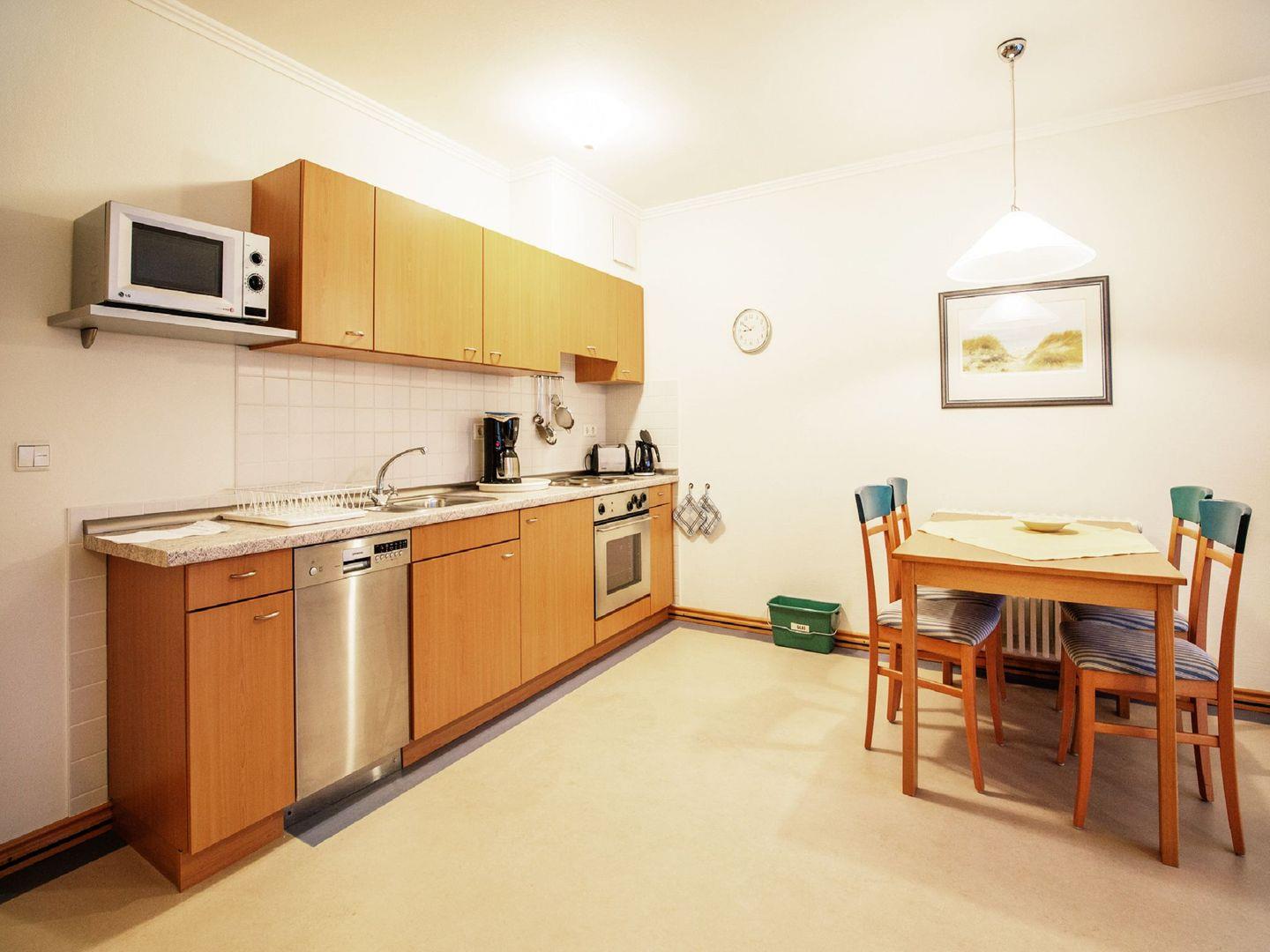 Der Wohnraum dieser freundlichen Ferienwohnung mit privatem Balkon verbindet eine Wohnküche mit einem Essbereich und einem Wohnzimmer. Die voll ausgestattete Küchenzeile überzeugt mit einem Geschirrspüler, einer Koch- und Backmöglichkeit, einem Toaster, einem Wasserkocher und einer Kaffeemaschine. Das Wohnzimmer punktet neben einer ausziehbaren Schlafcouch auch mit einem LED-Flachbildfernseher, einem DVD-Player und einer Stereo-Anlage. Im separaten Schlafzimmer steht ein Doppelbett. Das Badezimmer verfügt über eine geräumige Dusche, ein Waschbecken, ein WC und einen großen Spiegel. Haustiere sind in dieser Wohnung herzlich willkommen.