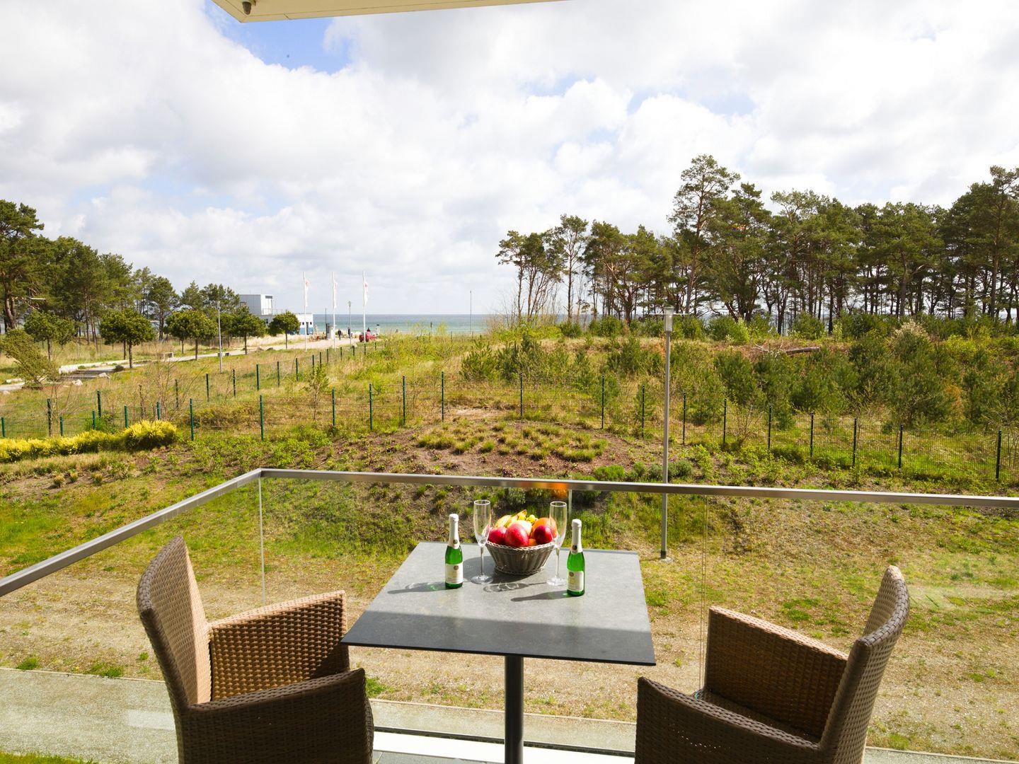 Moderne Ferienwohnung in Binz mit Meerblick, Balkon und privater Sauna für entspannte Urlaubstage.