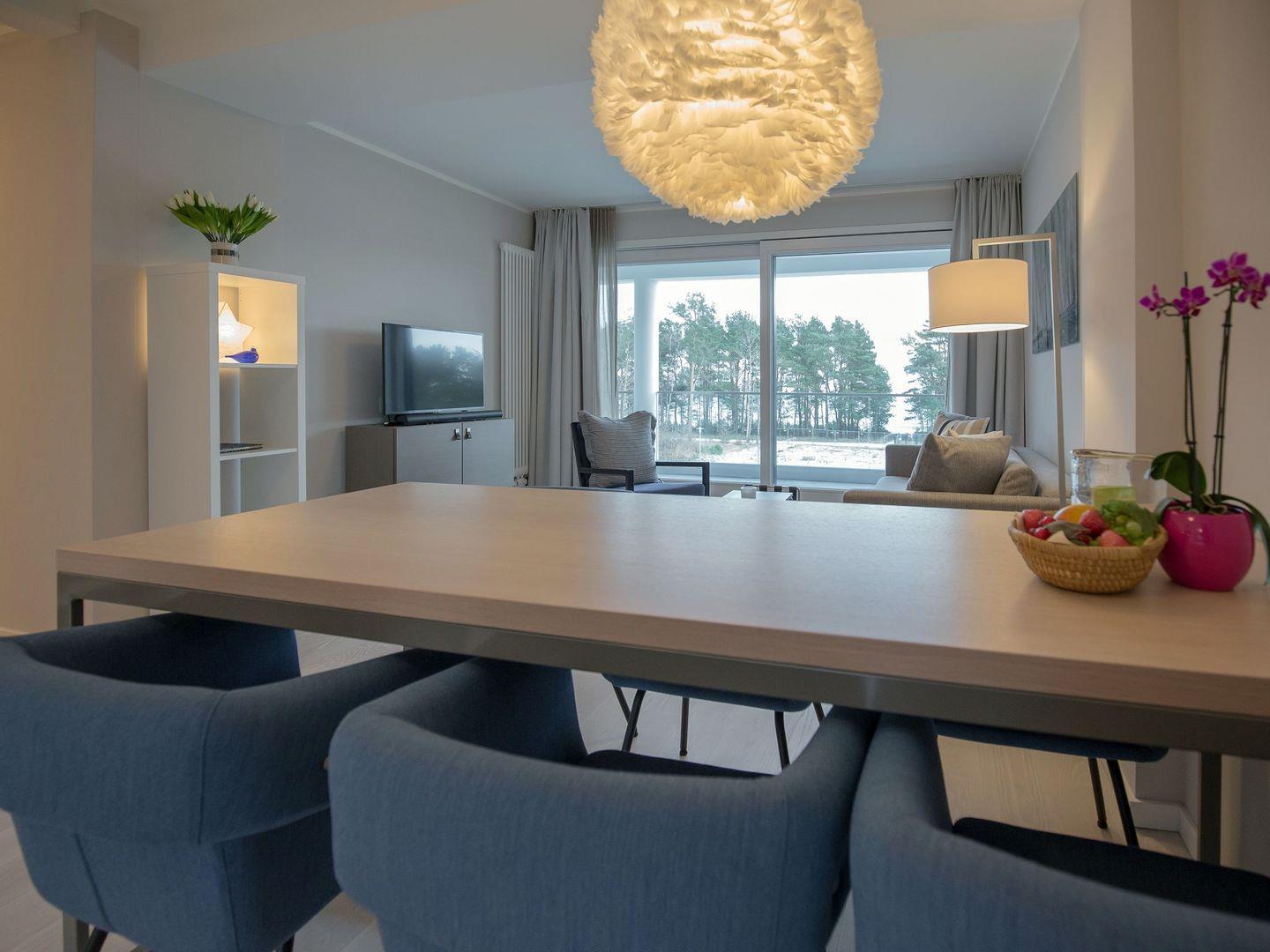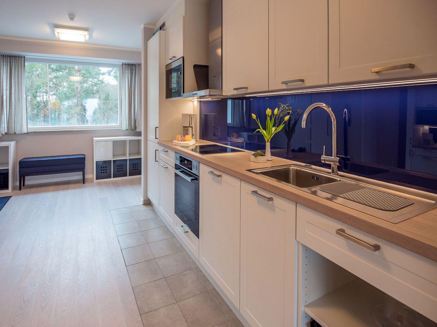 Dünenresidenz Neues Prora, Wohnzimmer mit LCD-TV und Blu-Ray-Player, Loggia mit Wind-, Regen- und Sichtschutz, Meerblick, eingerichtete Küchenzeile mit Geschirrspüler, Mikrowelle und Backofen, Kühl- und Gefrierkombination, 2 Schlafzimmer mit Doppelbett und je einen Fernseher, Aufbettung von 4 auf 6 Personen möglich, ein Bad mit Dusche, Gäste-WC, kostenfreier WLAN-Anschluss, Haustiere nicht erlaubt, Nichtraucher, eigener Strandkorb (Mai - September) inklusive