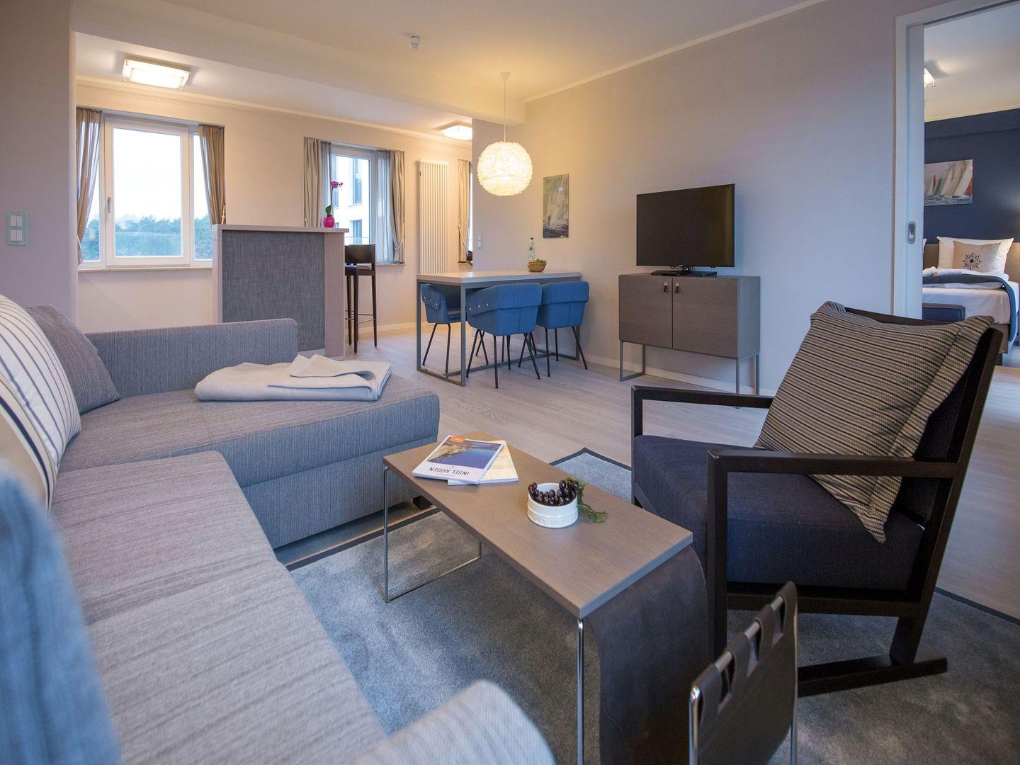 Dünenresidenz Neues Prora, Wohnzimmer mit LCD-TV, DVD-Player, Mini-Stereoanlage, zwei Balkone mit Meerblick, eingerichtete Küchenzeile mit Geschirrspüler und Backofen, 2 Schlafzimmer mit Doppelbett und davon eines mit Fernseher, ein Schlafzimmer mit Einzelbett, ein Bad mit Dusche, eigene Sauna, ein Bad mit Badewanne, eigene Waschmaschine, Bügelbrett und Bügeleisen, kostenfreier WLAN-Anschluss, Spielesammlung, Haustiere erlaubt, Nichtraucher