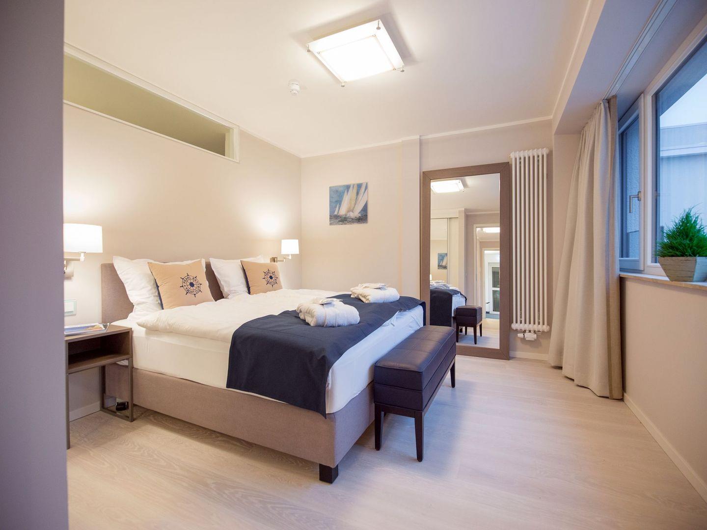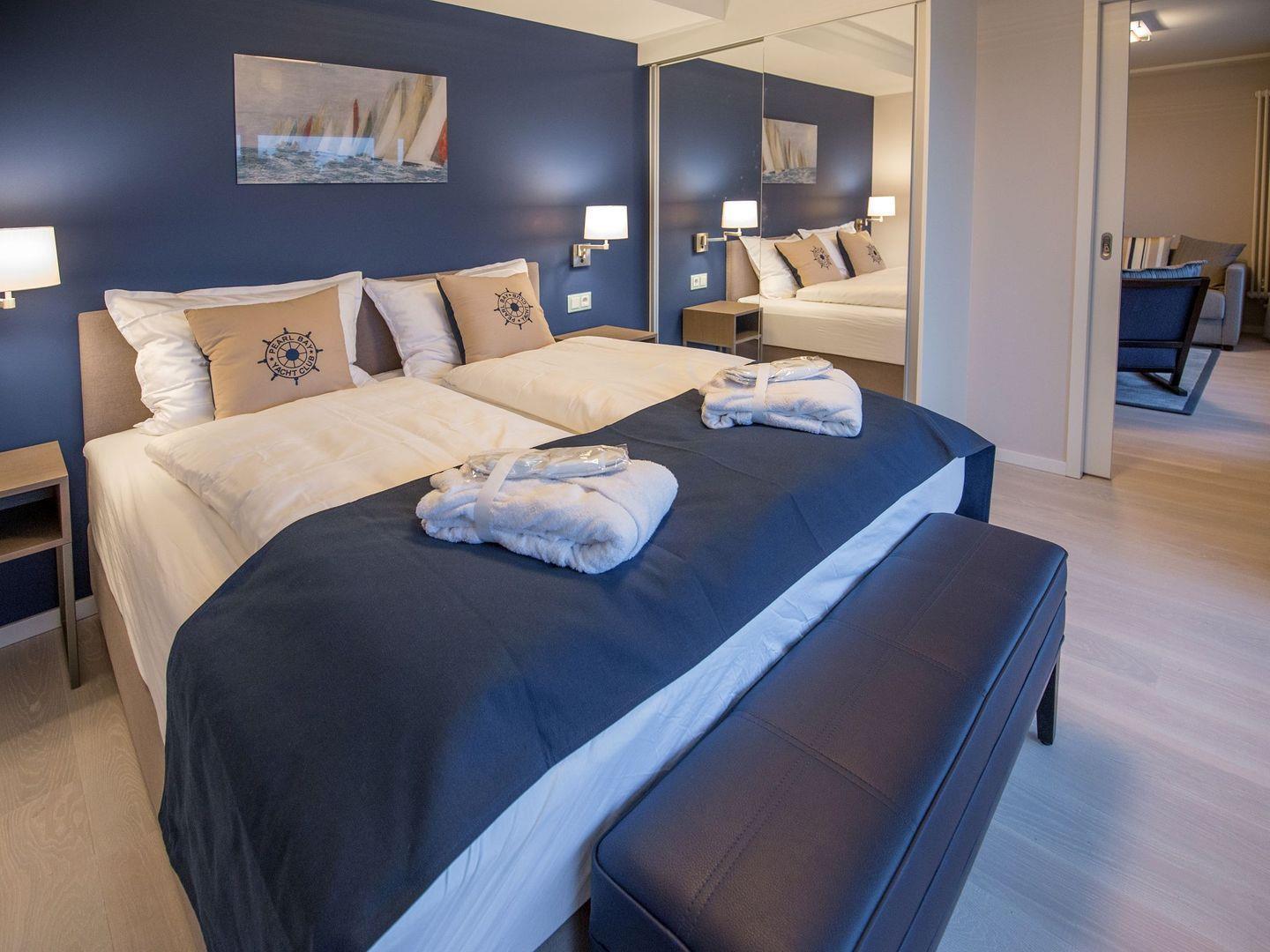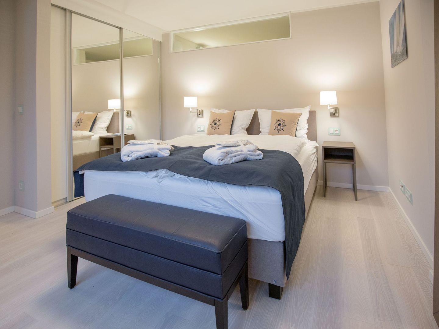 Diese hochwertig eingerichtete Ferienwohnung mit privater Loggia mit Seeblick besteht aus einem großen Wohnraum mit Küche und Essbereich sowie zwei separaten Schlafzimmern. Die Küchenzeile ist eingerichtet und überzeugt mit einem Kochfeld, einem Backofen, einem Geschirrspüler, einer Mikrowelle, einem Wasserkocher, einer Kaffeemaschine und einem Toaster. Im Wohnzimmer, wie auch in einem der beiden Schlafzimmer stehen LCD-TV. Beide Schlafzimmer liegen separat und sind mit einem Doppelbett ausgestattet. Das Badezimmer überzeugt mit einer geräumigen Dusche, einem Waschbecken, einem WC und einem großen Spiegel. Das gewisse Extra bietet die private Sauna. In der Zeit von Mai bis September ist ein eigener Strandkorb am Strand gegen Aufpreis buchbar.