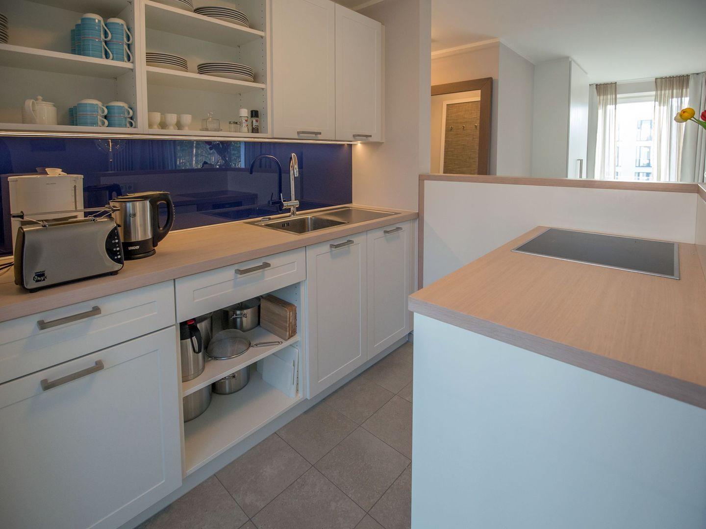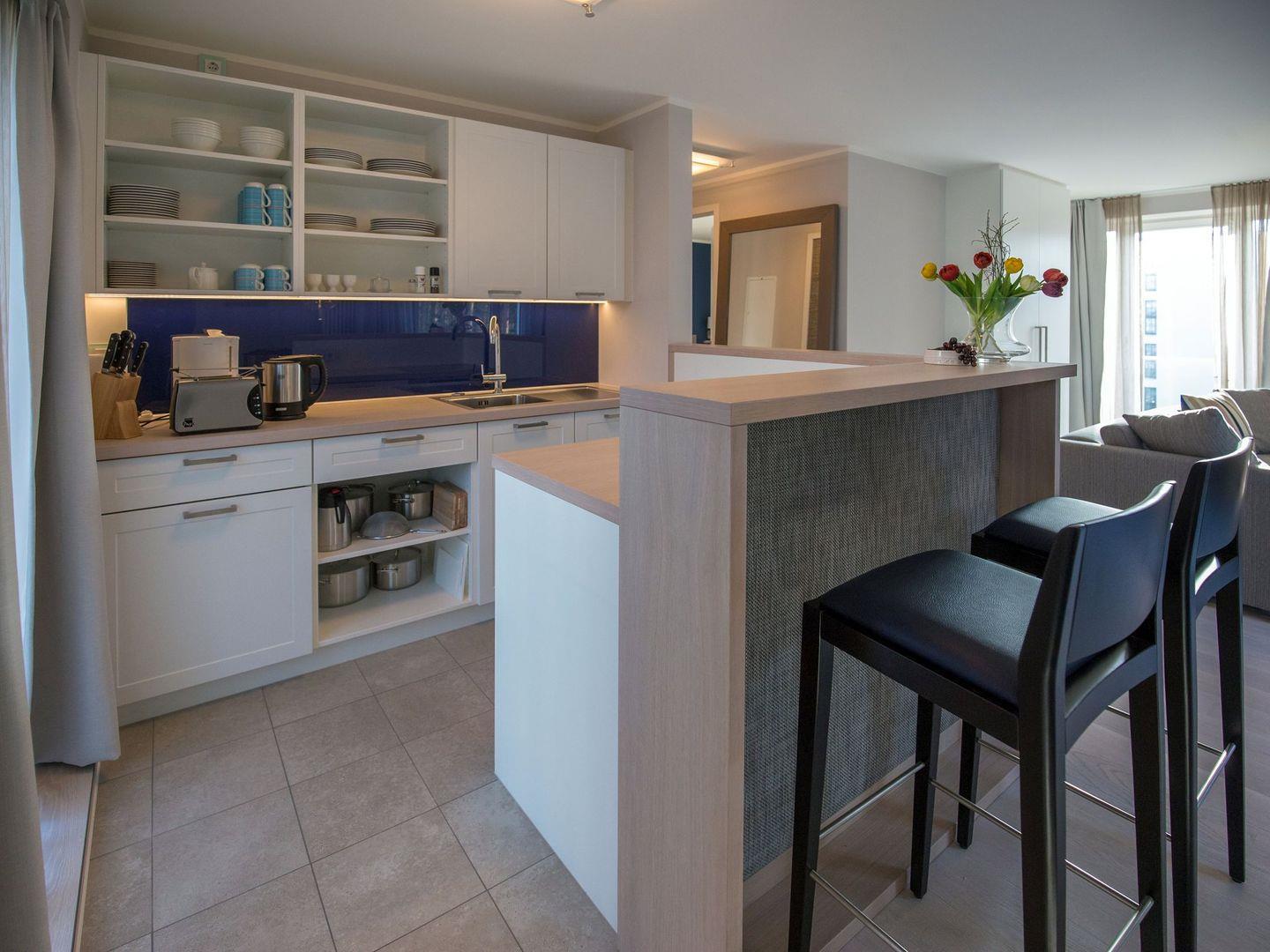 Dünenresidenz Neues Prora, Wohnzimmer mit LCD-TV, sonnige Landseite, eingerichtete Küchenzeile mit Geschirrspüler und Backofen, Schlafzimmer mit Doppelbett und Fernseher, kostenfreier WLAN-Anschluss (32 Mbit/s) Bad mit Dusche, Haustiere erlaubt, Nichtraucher,ei gener Strandkorb (Mai - September) kostenfrei nutzbar