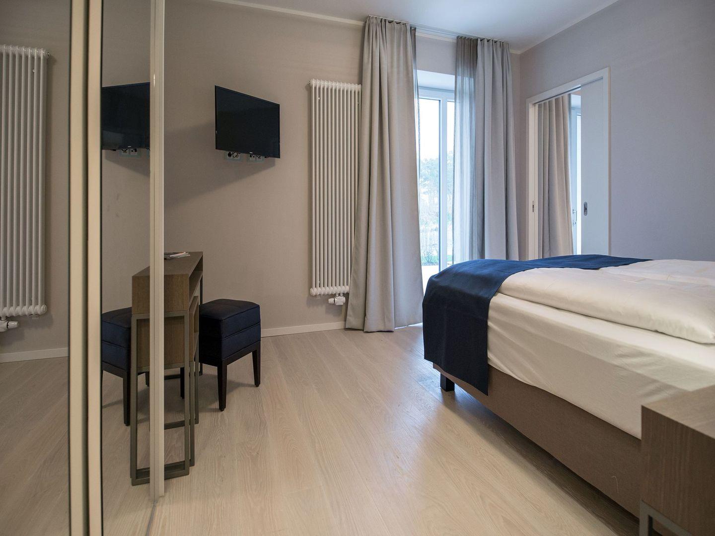 Dünenresidenz Neues Prora, Wohnzimmer mit LCD-TV, Terrasse, eingerichtete Küchenzeile mit Geschirrspüler, Mikrowelle und Backofen, Schlafzimmer mit Doppelbett und Fernseher, Bad mit Dusche, eigene Waschmaschine, kostenfreier WLAN-Anschluss, Haustiere erlaubt, Nichtraucher