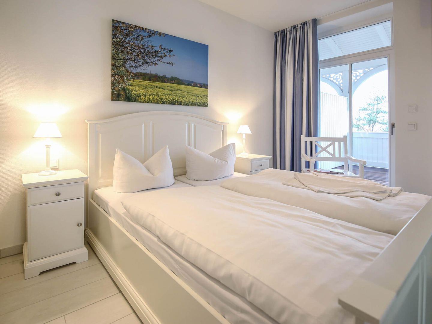 In dieser geräumigen Ferienwohnung genießen Sie Ihr Frühstück auf einem der beiden privaten Balkone mit Seeblick. Der großzügige Wohnraum verbindet das Wohnzimmer mit LCD-Flachbildschirm mit dem Essbereich und der Küche. Diese ist voll eingerichtet und verfügt über einen Geschirrspüler, einen 4-Platten-Herd, eine Mikrowelle mit Backfunktion, einen Toaster, einen Wasserkocher und eine Kaffeemaschine. Beide Schlafzimmer sind mit einem gemütlichen Doppelbett ausgestattet, eines hat einen Balkon. Im Badezimmer erwarten Sie eine geräumige Dusche, ein Waschbecken, ein WC und ein großer Spiegel. Die Nutzung der hauseigenen Sauna sowie ein Tiefgaragenstellplatz sind inklusive. In der Zeit von Mai bis September ist ein eigener Strandkorb am Strand inklusive.