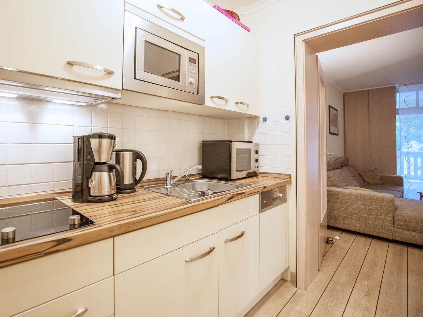 Villa Seeadler; Wohnraum mit seeseitigem Balkon, Schlafraum mit Doppelbett und Oberlicht, neue Pantry mit Geschirrspüler, Mikrowelle, 2-Platten-Cerankochfeld, Dusche/WC, Kabel-TV (LED), DVD-Spieler, Stereo-Anlage, Haustiere erlaubt, Nichtraucher, kostenfreier WLAN-, und DSL-Anschluss, maximale Belegung mit 2 Erwachsene und 1 Kind