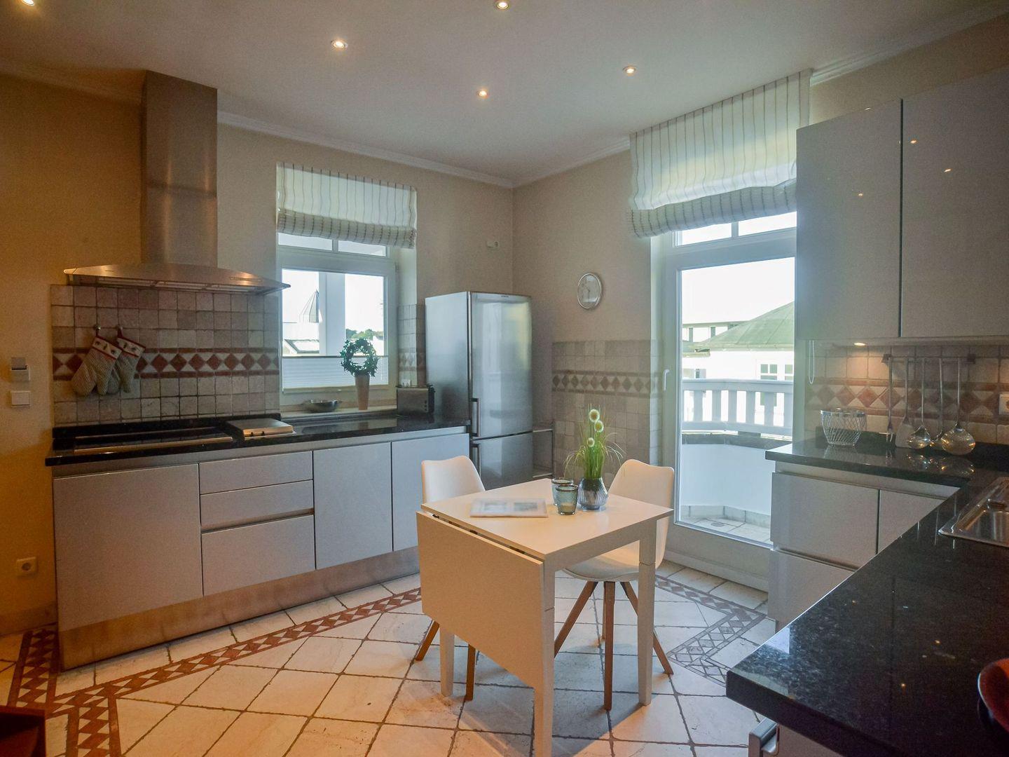 Villa Seeadler; Wohnzimmer, Schlafzimmer mit Doppelbett, Wohnküche mit Geschirrspüler, Mikrowelle, 4-Platten-Herd, Dusche/ WC, Gäste-WC mit Waschmaschine, 2 seeseitige Balkone, HiFi-Anlage, 2 Fernseher (1x LCD-TV), DVD-Player, Wohnung über 2 Etagen, keine Haustiere erlaubt, Nichtraucher, kostenfreier WLAN- und DSL-Anschluss, Belegung mit max. 4 Personen, Juni bis September mindestens 7 Übernachtungen, von Mai bis September eigener Strandkorb am Strand gegen Aufpreis buchbar
