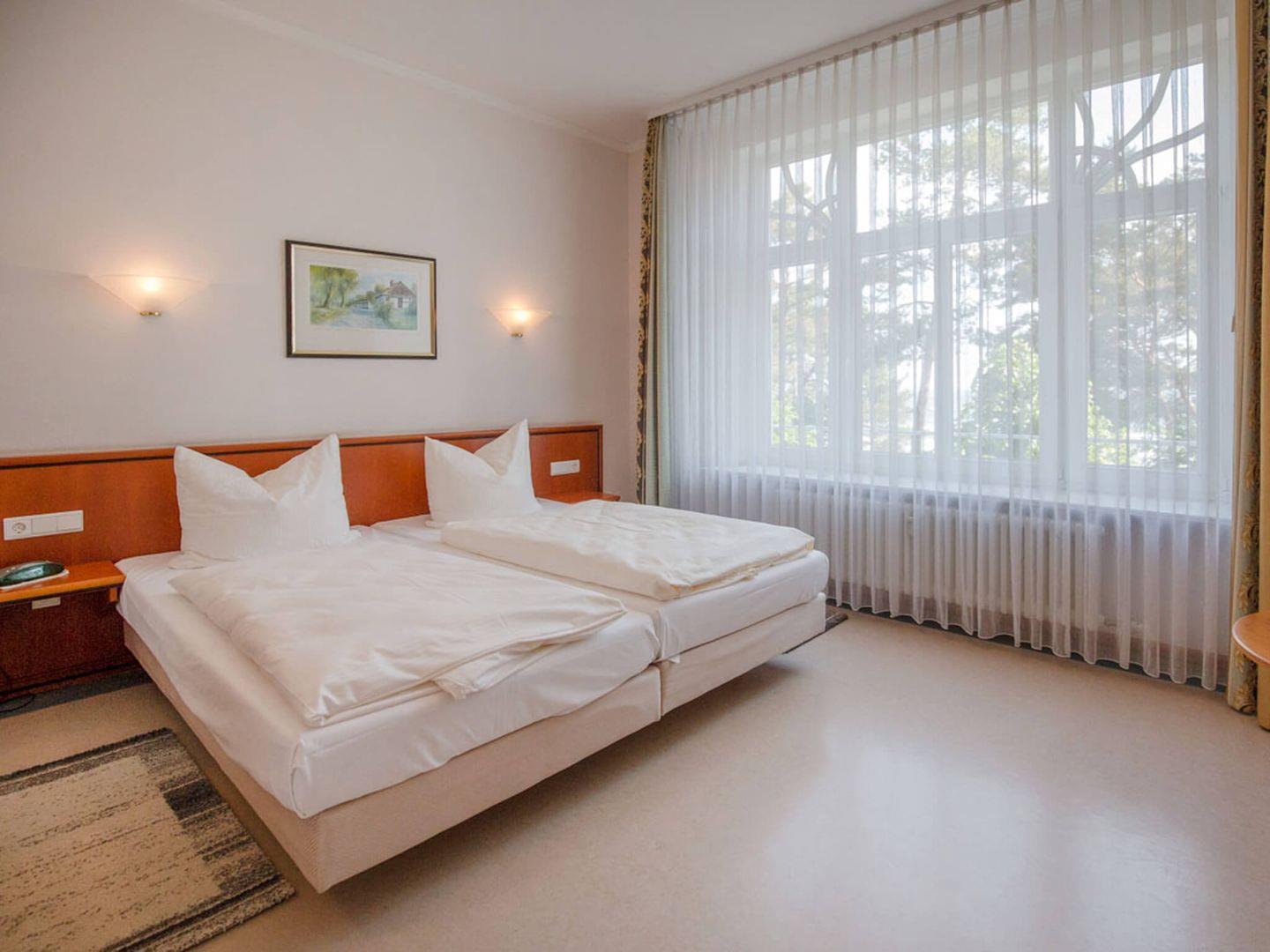 Villa Elfeld; Wohnzimmer mit seeseitigem Erker, Schlafzimmer mit seeseitiger Fensterfront, eingerichtete neue Küchenzeile mit Geschirrspüler und Mikrowelle, Dusche/ WC, Kabel-TV (LCD), DVD-Player, Stereo-Anlage, Haustiere nicht erlaubt und Nichtraucher, kostenfreier WLAN-Anschluss. In der Zeit von Mai bis September ist ein eigener Strandkorb am Strand inklusive.