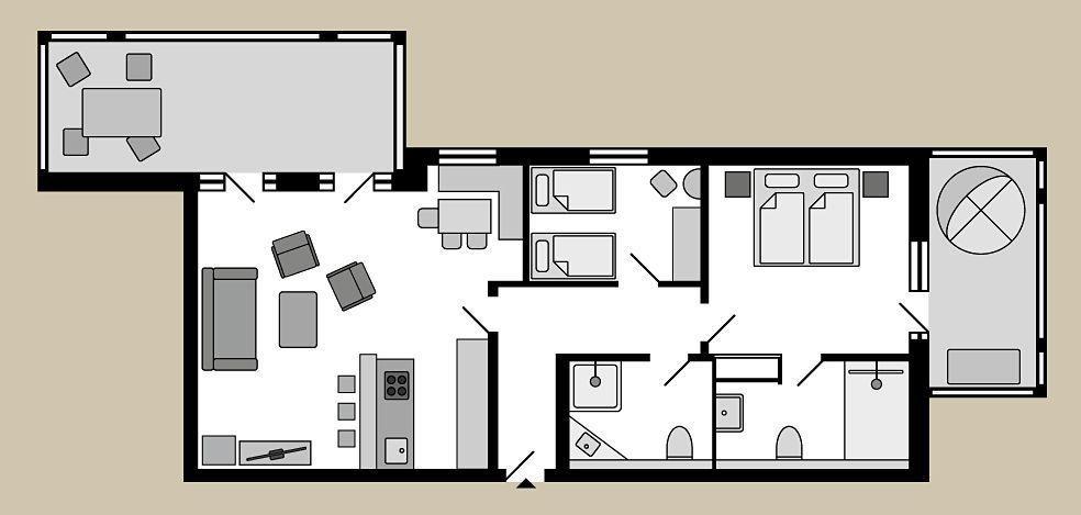 In dieser modernen Ferienwohnung genießen Sie Ihr Frühstück auf einem Ihrer beiden privaten Balkone, einer davon mit seitlichem Seeblick und Strandkorb. Der großzügige Wohnraum besteht aus dem Wohnzimmer, dem Essbereich und der offenen Küche. Diese bietet einen 4-Platten-Herd, einen Backofen, einen Geschirrspüler, eine Mikrowelle, eine Kaffeemaschine, einen Wasserkocher und einen Toaster. Im Wohnzimmer stehen die ausziehbare Schlafcouch und der LCD-TV. Im Elternschlafzimmer findet sich ein Doppelbett, im Kinderschlafzimmer stehen zwei Einzelbetten. Es gibt zwei Badezimmer mit geräumiger Dusche, Waschbecken, WC und großem Spiegel.
