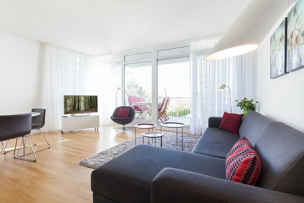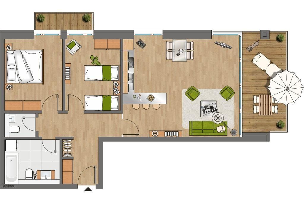 Das Apartment verfügt über kostenfreies WLAN und besteht aus zwei Schlafzimmern mit Doppelbett (1,60 m x 2,00 m) bzw. zwei Einzelbetten (0,90 m x 2,00 m) und jeweils eigenem Flatscreen-TV, einem Wohnbereich mit Flatscreen-TV-HiFi-Anlage und Blu-ray/ DVD-Player, zwei Balkonen sowie aus einem hochwertigem Bad mit Whirlbadewanne, Waschmaschine, Föhn, Kosmetikspiegel und einem zweiten separatem WC.