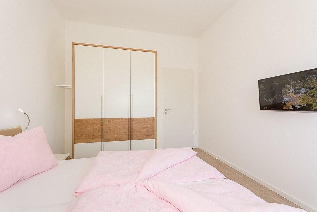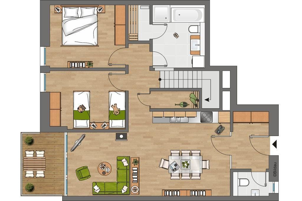 Das Nichtraucher-Penthouse mit Sauna und Fußbodenheizung besteht aus zwei Schlafzimmern mit jeweils einem Doppelbett und Flatscreen-TV, einem Wohnbereich mit Doppelschlafcouch (2 x 0,90 m x 2,00 m), Kamin (Kaminholz ist nicht inbegriffen), TV-HiFi-Anlage und Flatscreen-TV mit Blu-ray/DVD-Player, einem Bad mit Dusche, Whirlbadewanne und separatem WC, einer Dachterrasse mit Ostseeblick und Strandkorb sowie einem Balkon mit seitlichem Meerblick.