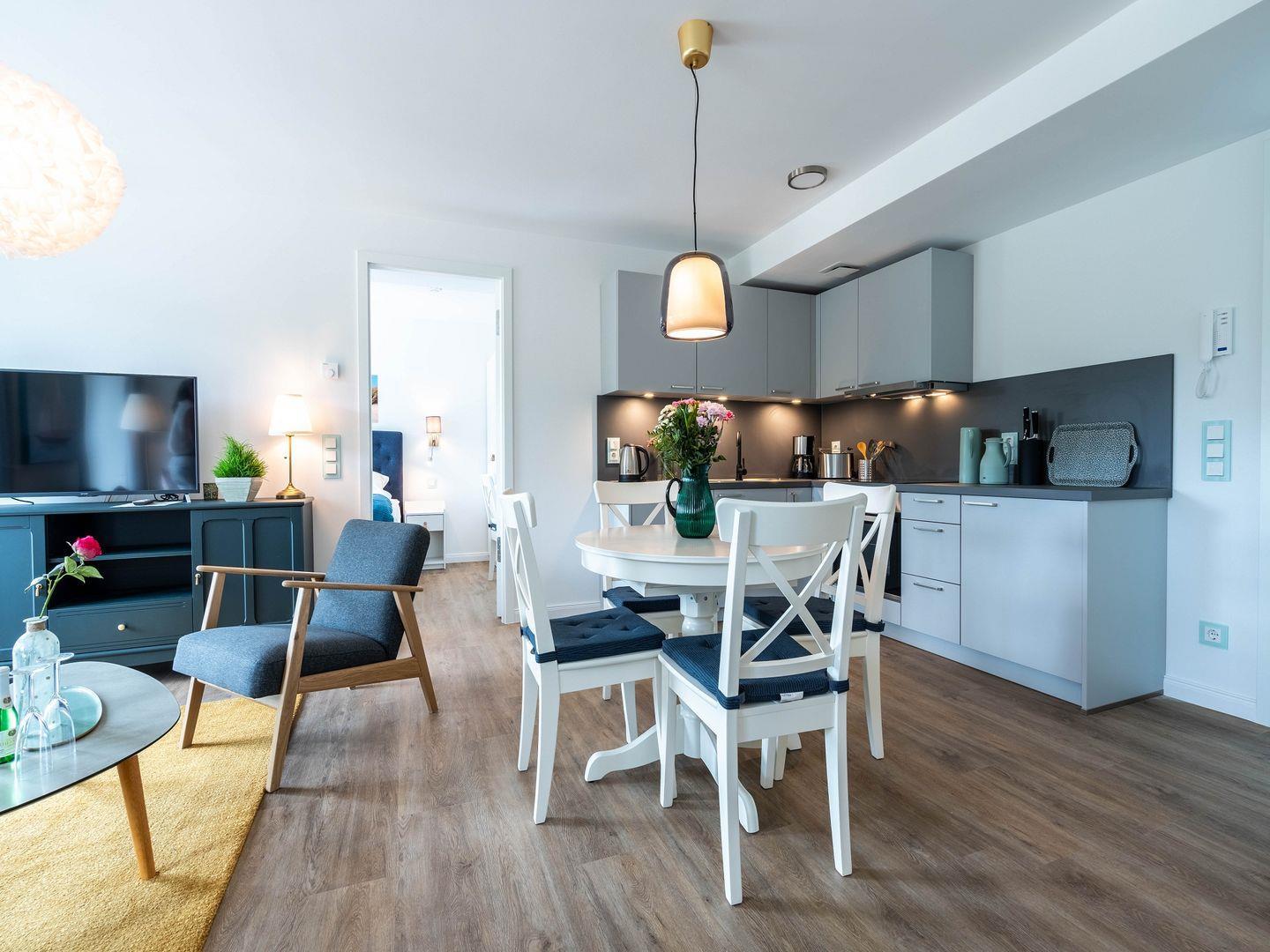 Dünenresidenz Neues Prora, Wohnzimmer mit LCD-TV, Balkon, eingerichtete Küchenzeile mit Geschirrspüler und Backofen, 2 Schlafzimmer mit Doppelbett und Fernseher, Bad mit Dusche, kostenfreier WLAN-Anschluss, Haustiere erlaubt, Nichtraucher