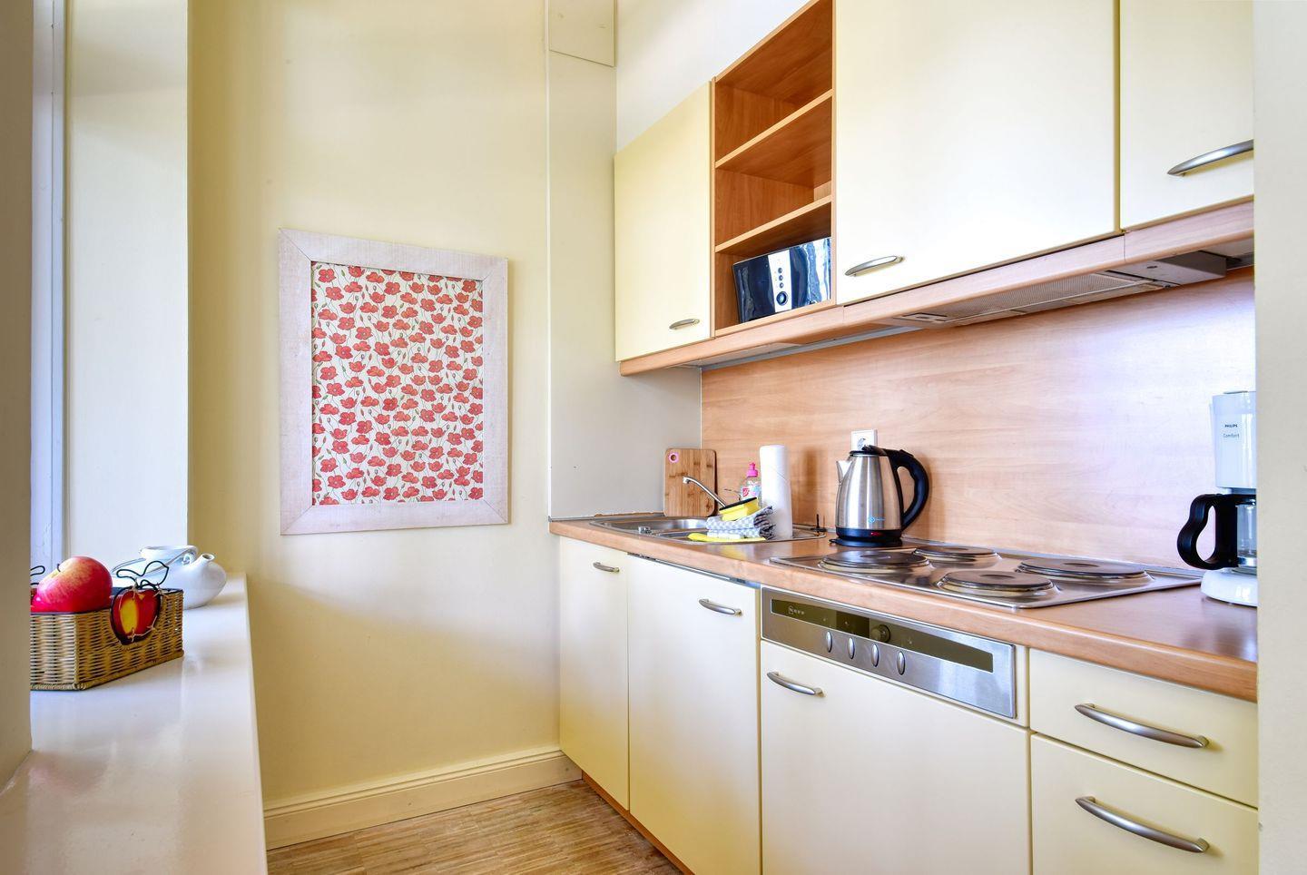 Beim Betreten der Wohnung empfängt Sie ein heller und freundlich gestalteter Wohnbereich, der zum Verweilen einlädt. Hier finden Sie ein bequemes Sofa, das zu gemütlichen Abenden vor dem Fernseher einlädt, sowie einen Esstisch, an dem Sie Ihre Mahlzeiten genießen können. Die voll ausgestattete Küche bietet alles, was Sie zur Zubereitung Ihrer Lieblingsgerichte benötigen.