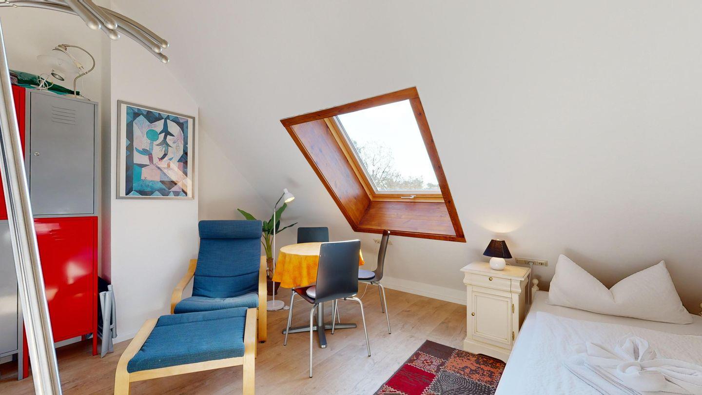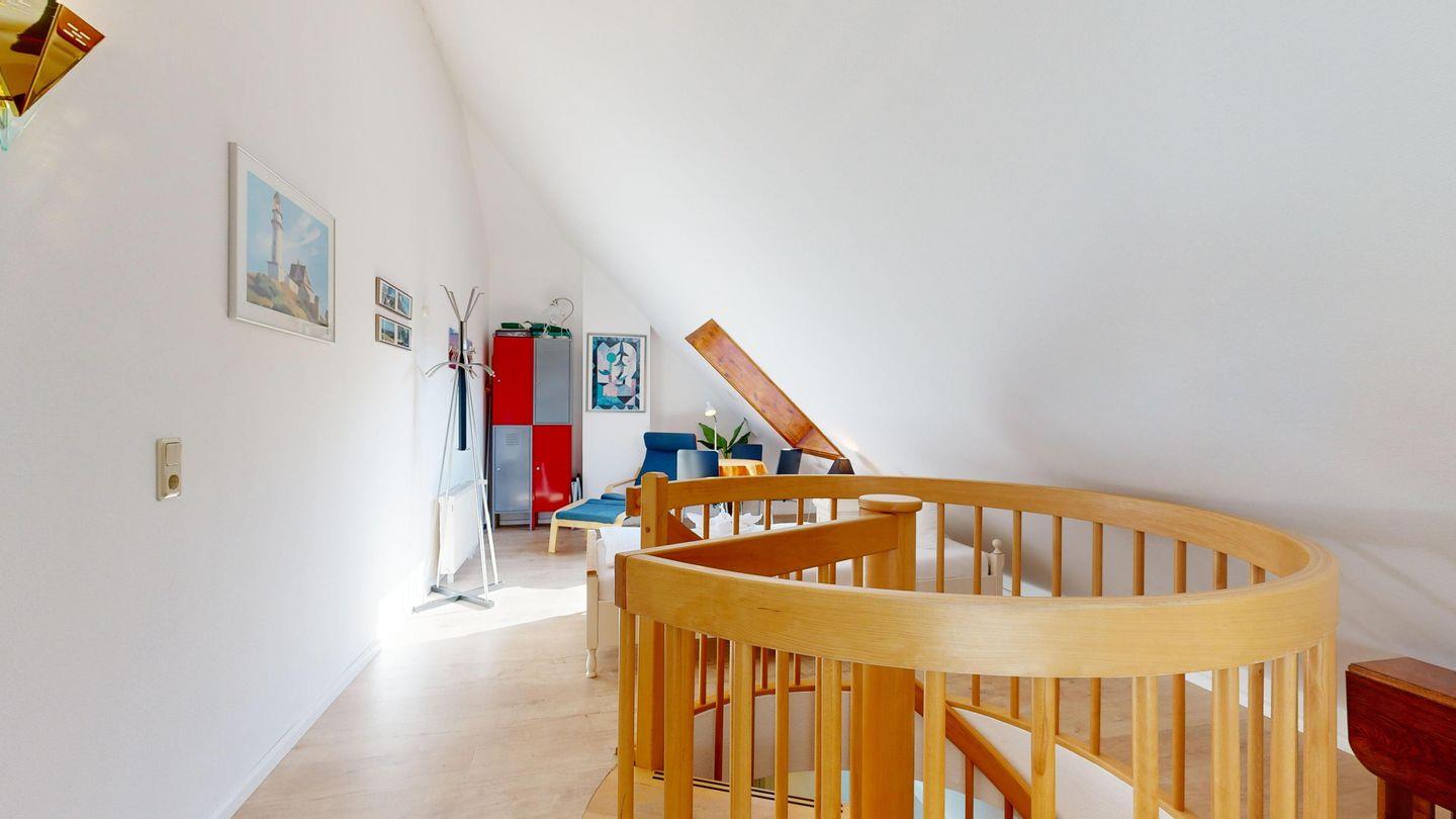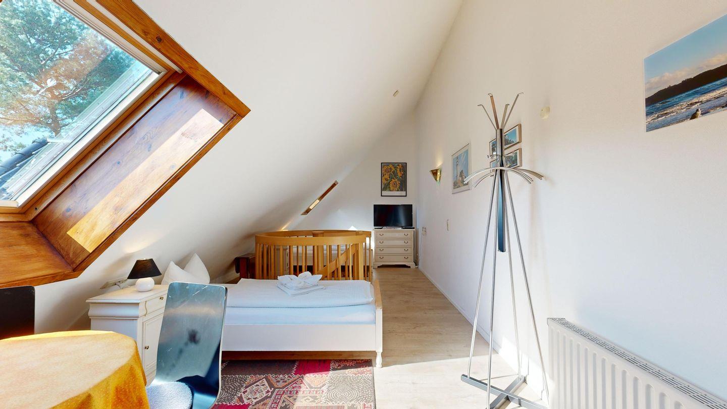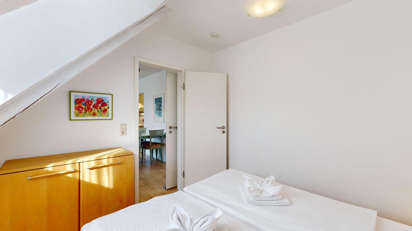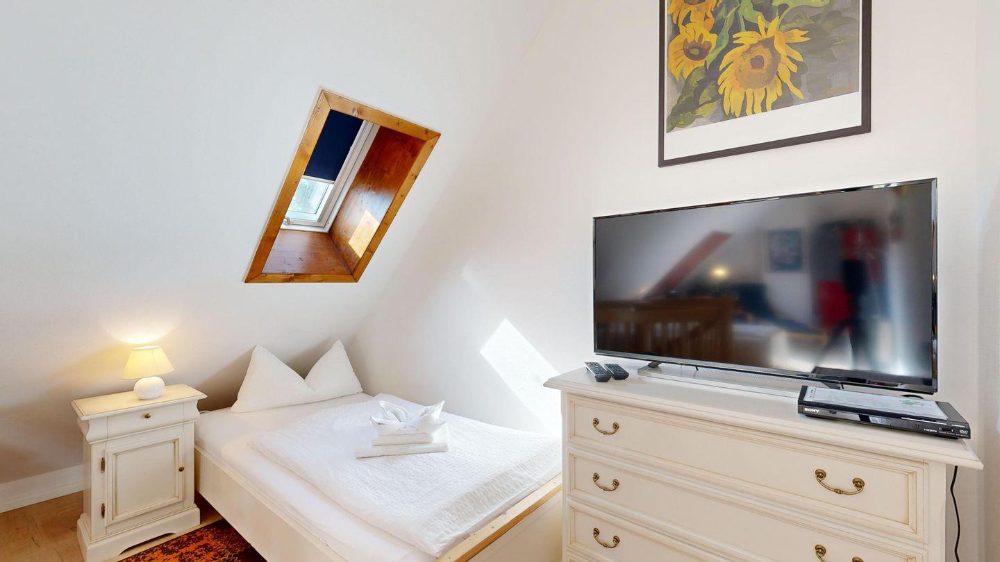 Über eine Wendeltreppe mit offenen Zugang gelangen Sie ins Dachgeschoss, wo sich das Schlafzimmer mit den zwei Einzelbetten und dem zusätzlichen TV befindet.