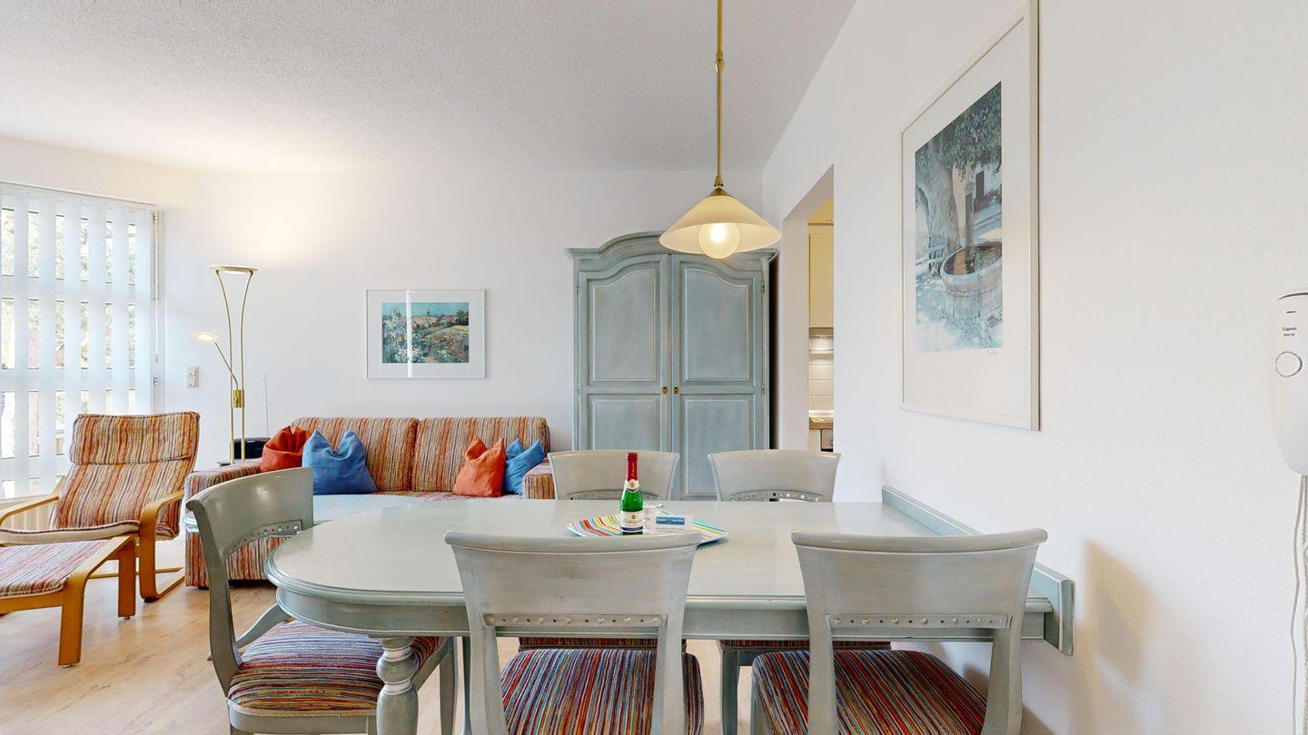 * Wohnzimmer: Couchgarnitur, Essplatz, Kabel-TV, Radio mit CD, DVD, Internetzugang (WLAN oder Kabel möglich)