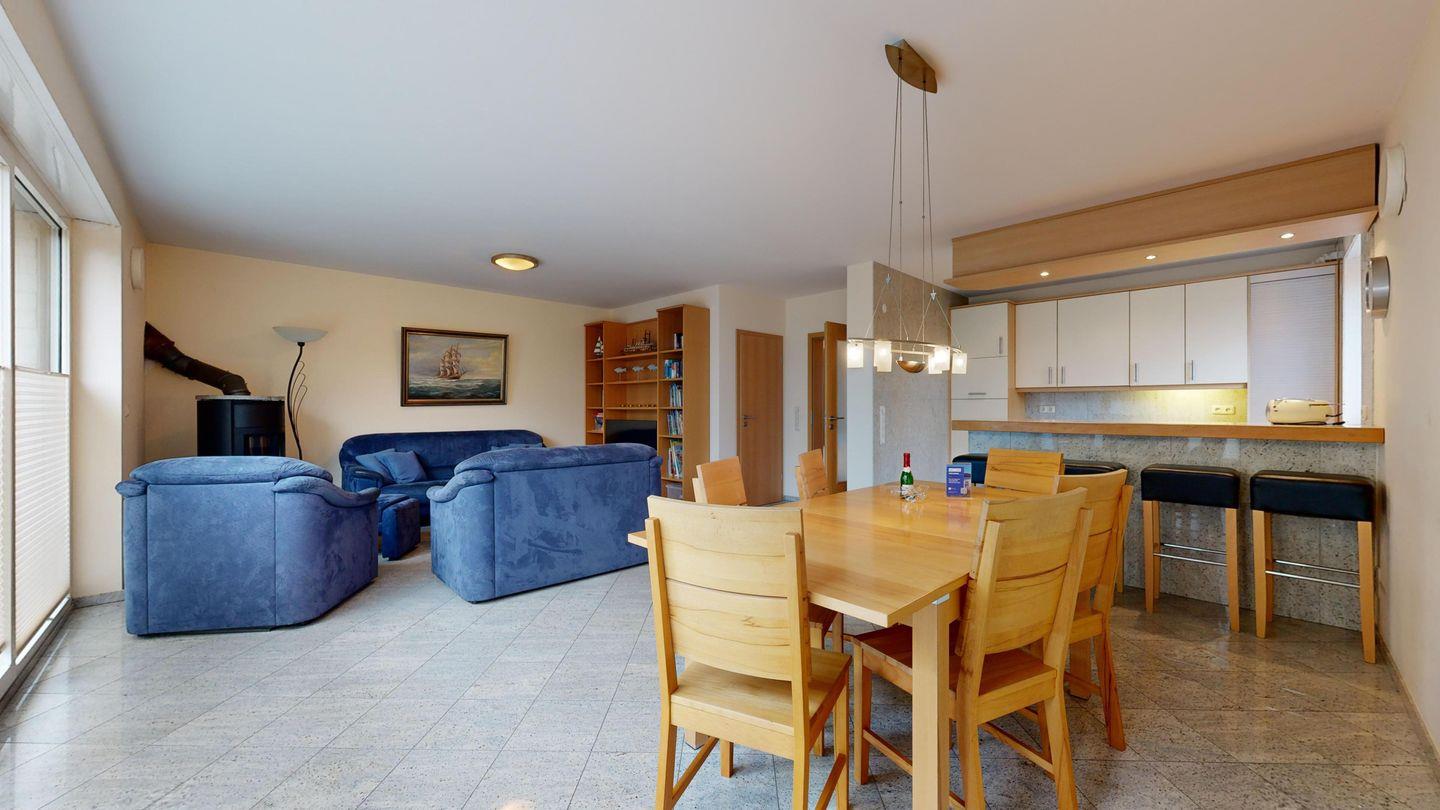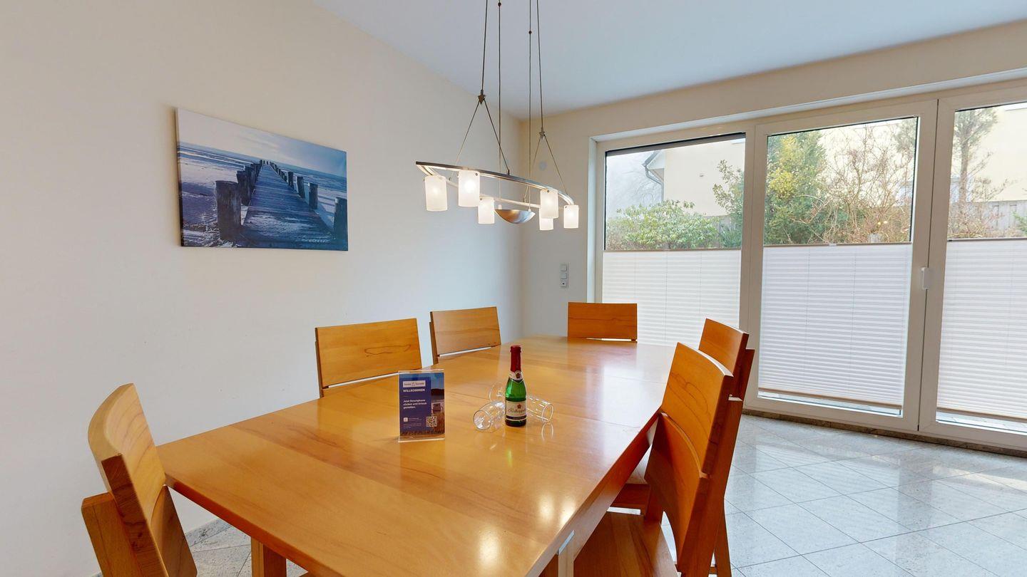 * Wohnzimmer (32 m²): Gemütliche Couchgarnitur, SAT-TV, WLAN-Internetanschluss, DVD-Player und Esstisch für 6 Personen, große Fensterfront zur südlich ausgerichteten Terrasse