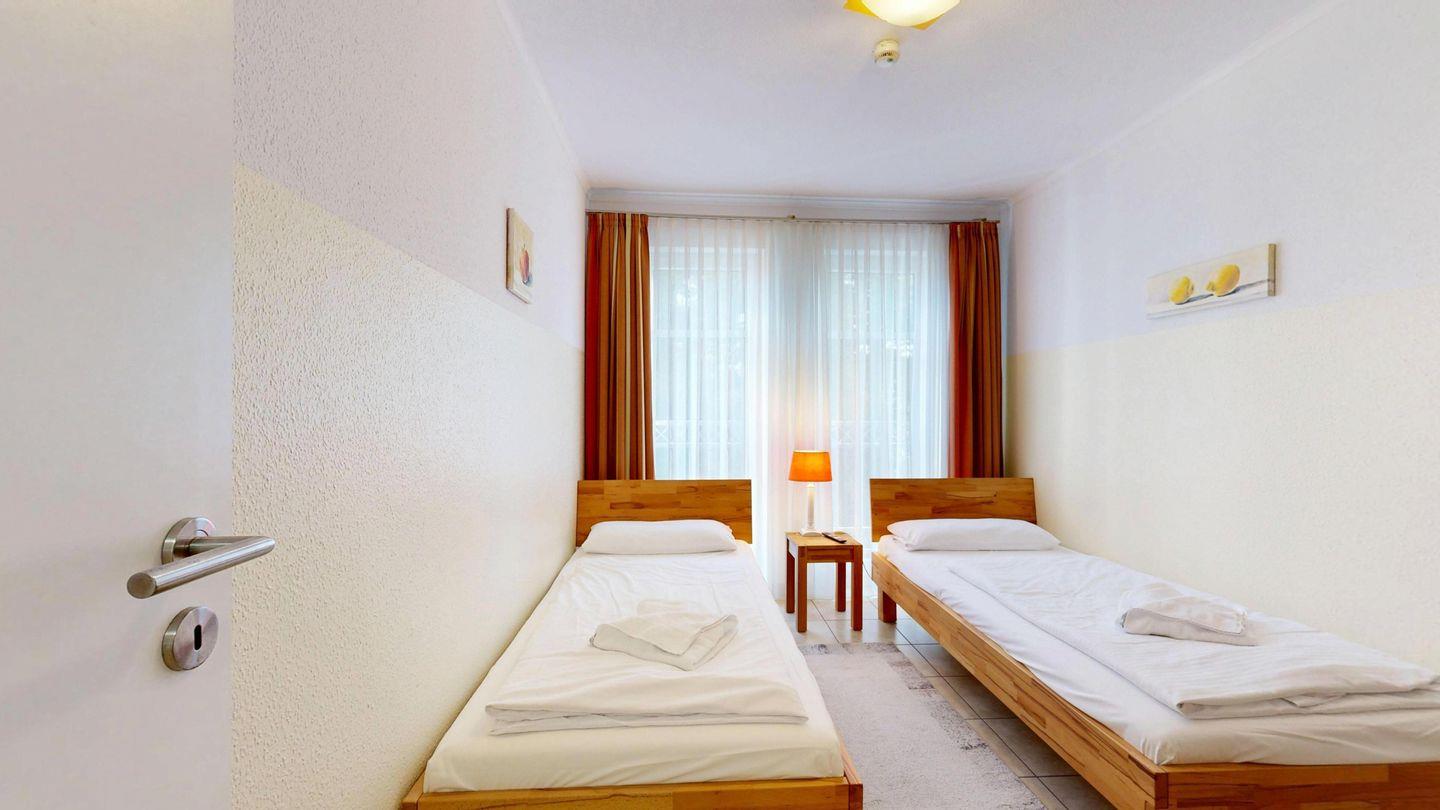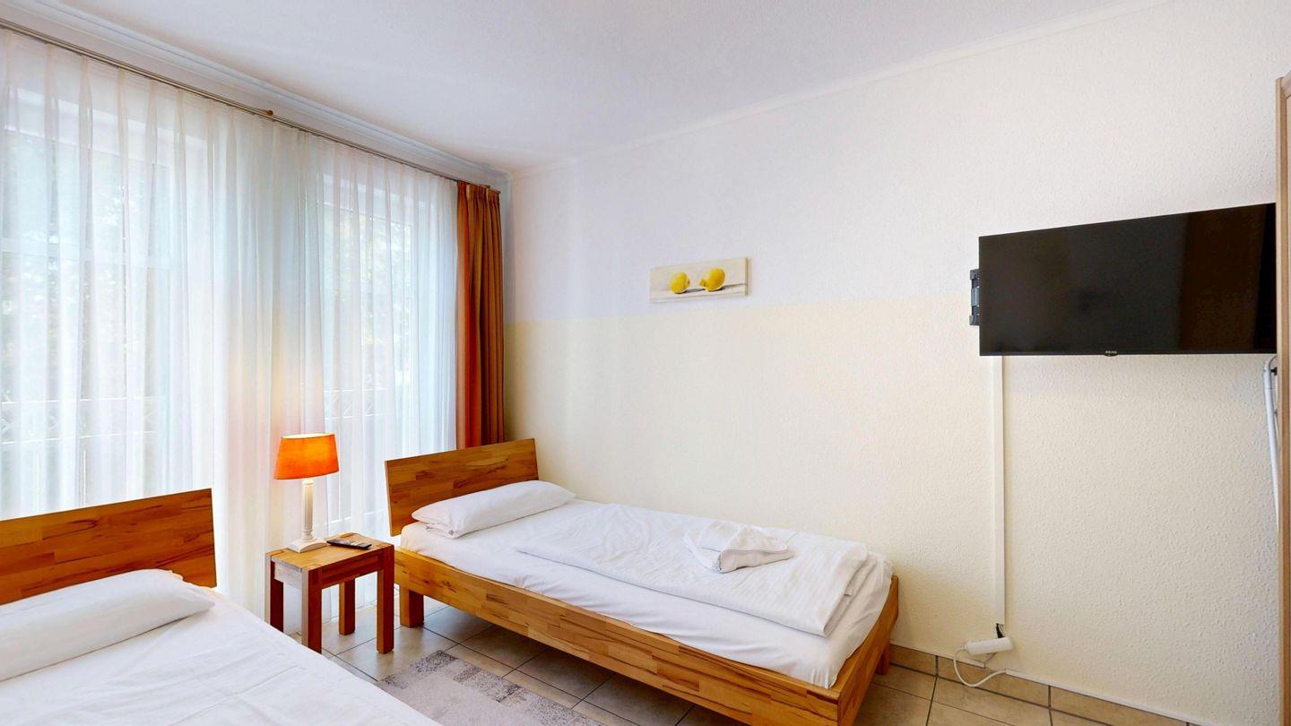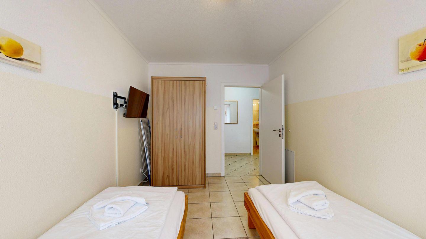 * 1 Schlafzimmer mit zwei Einzelbetten (90 x 200 cm), Schrank und TV