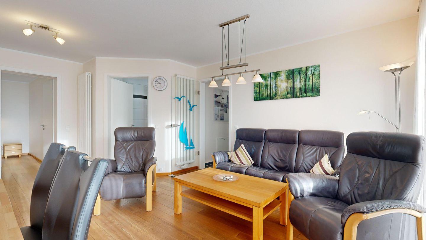 * Wohnzimmer: Leder-Couchgarnitur, Kabel-TV, CD-Player, WLAN-Internetanschluss, Essplatz, Echtholzparkett-Böden