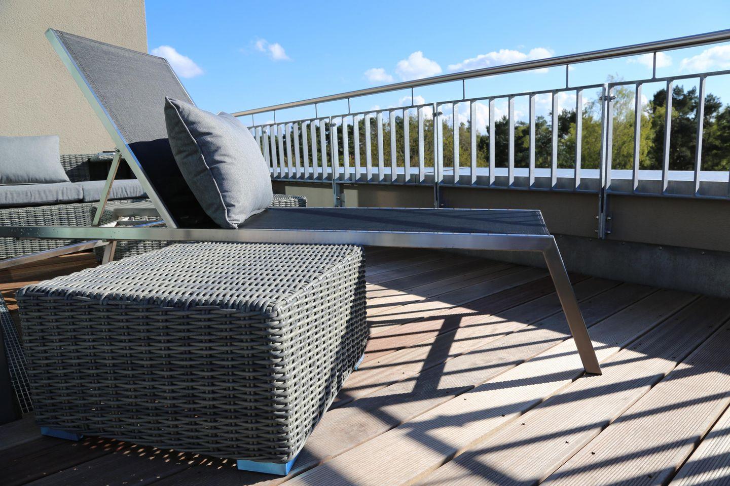 * 1 umlaufender Balkon mit Süd-Terrasse, Sitzgarnitur, Sonnenliegen