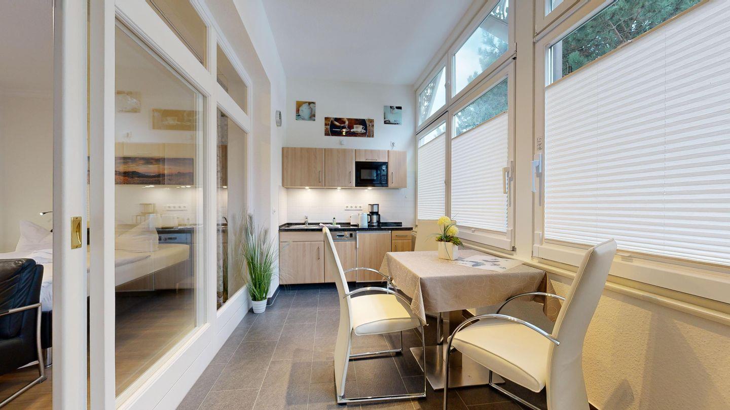 * Veranda: Essplatz, große Fensterfront, Küchenzeile mit Spülmaschine, Cerankochfeld mit 2 Platten, Mikrowelle, Toaster, Kaffeemaschine, Eierkocher, Wasserkocher