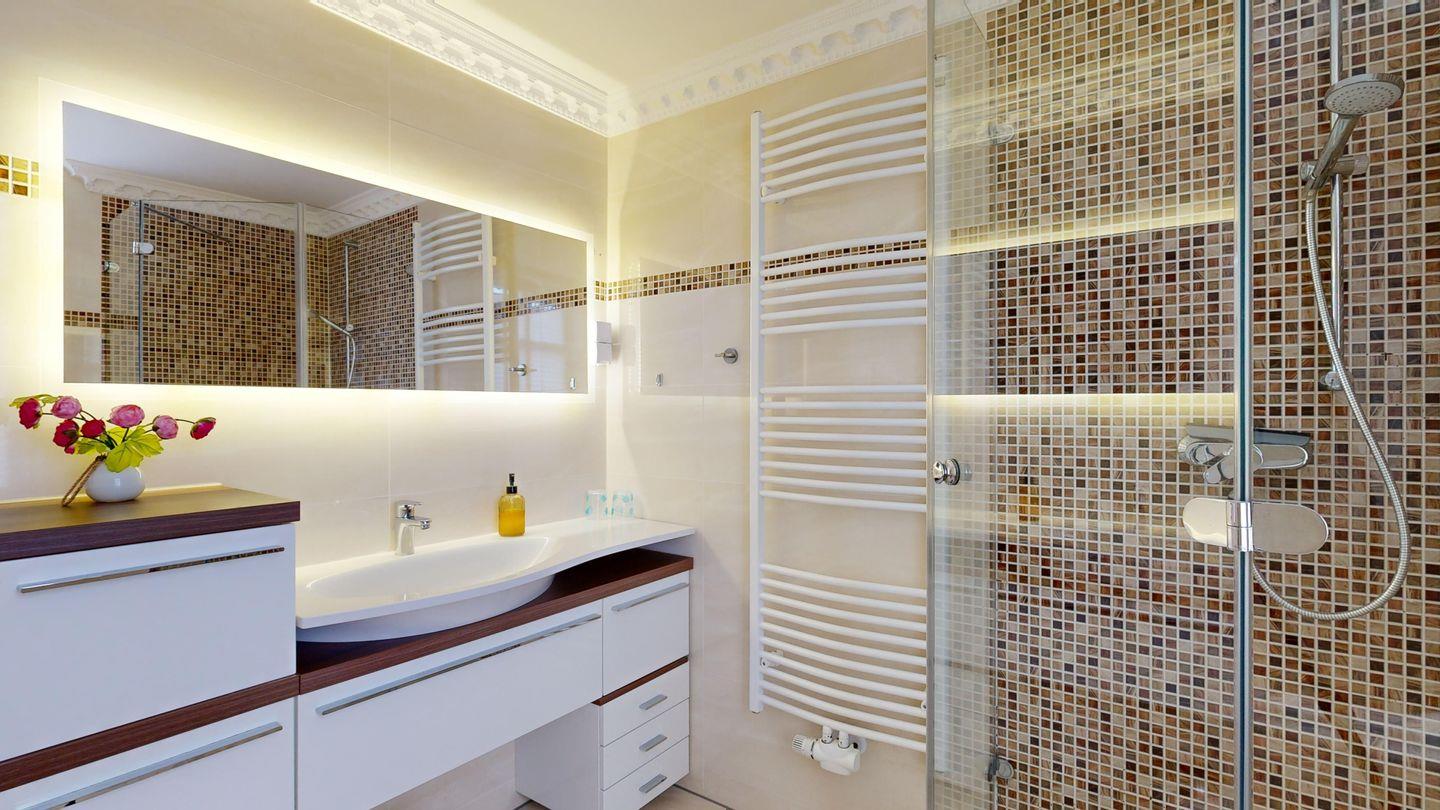 * Badezimmer mit Badewanne, Dusche, WC und Föhn