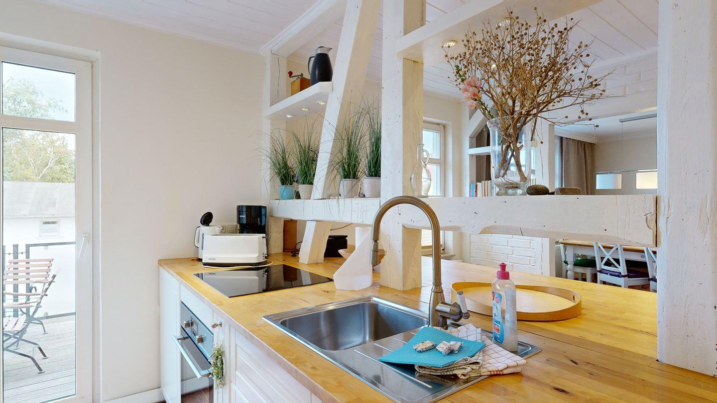 * Küche: Moderner Küchenbereich mit großer Arbeitsfläche, Ceran-Herd mit Backofen, Spülmaschine, Toaster, Kaffeemaschine, Wasserkocher