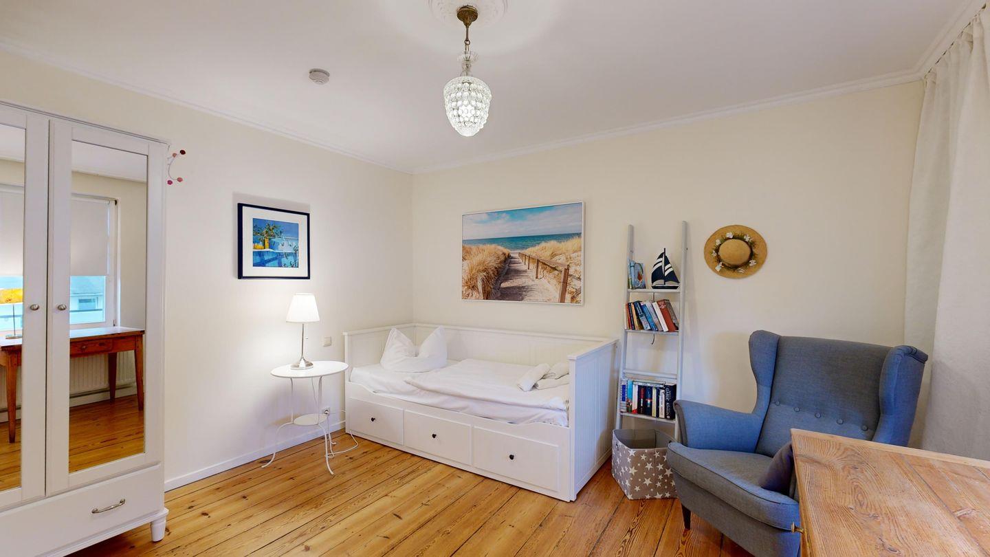 * 1 Schlafzimmer mit einem Einzelbett, Schrank. Das Einzelbett kann ausgezogen werden und so kann eine 6. Schlafgelegenheit geschaffen werden.