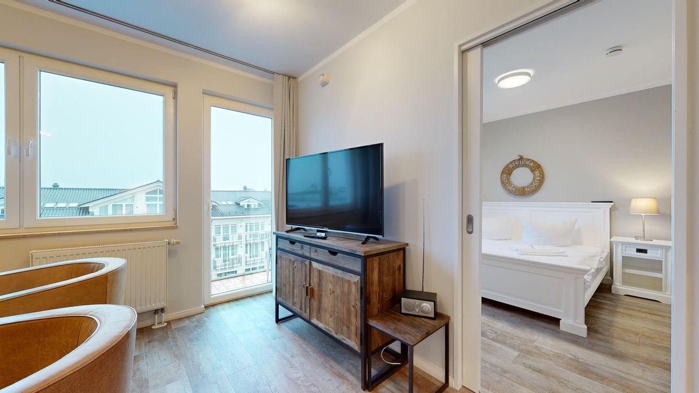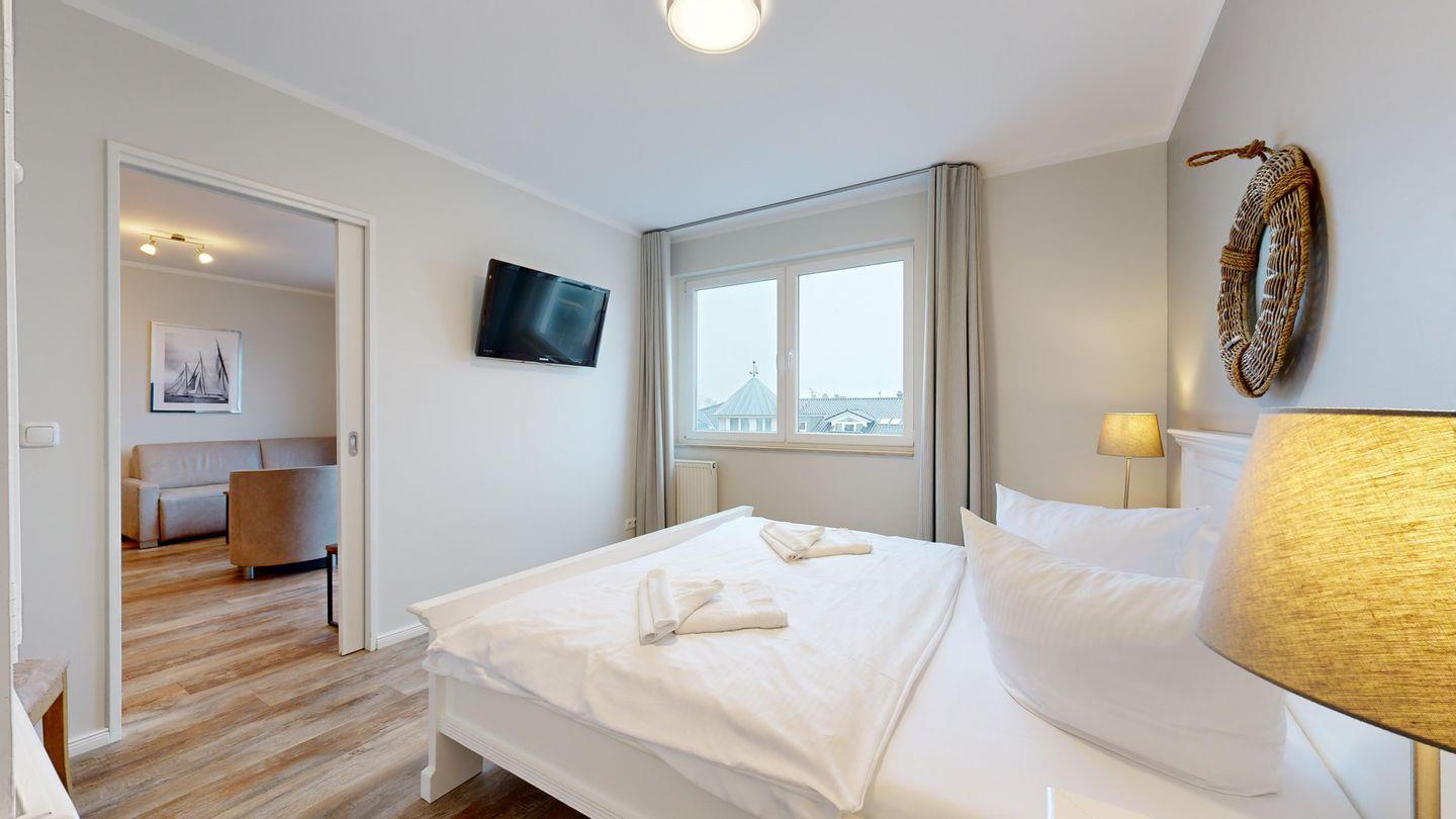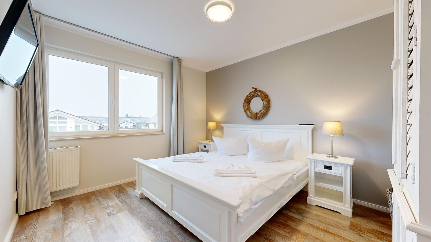 * 1 Schlafzimmer mit einem Doppelbett, Kleiderschrank und TV