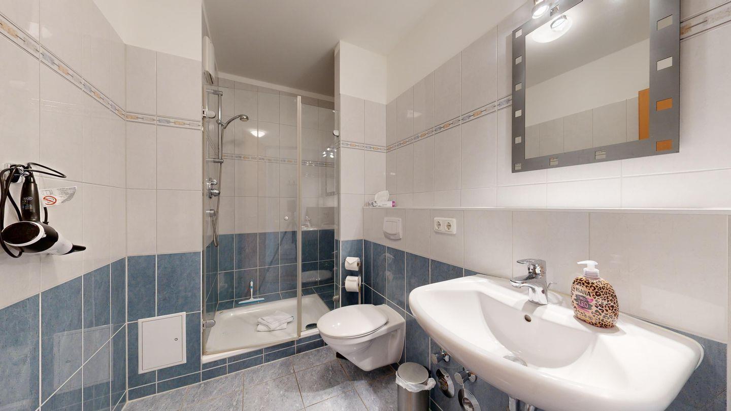 * Badezimmer mit großer Dusche, Föhn und WC