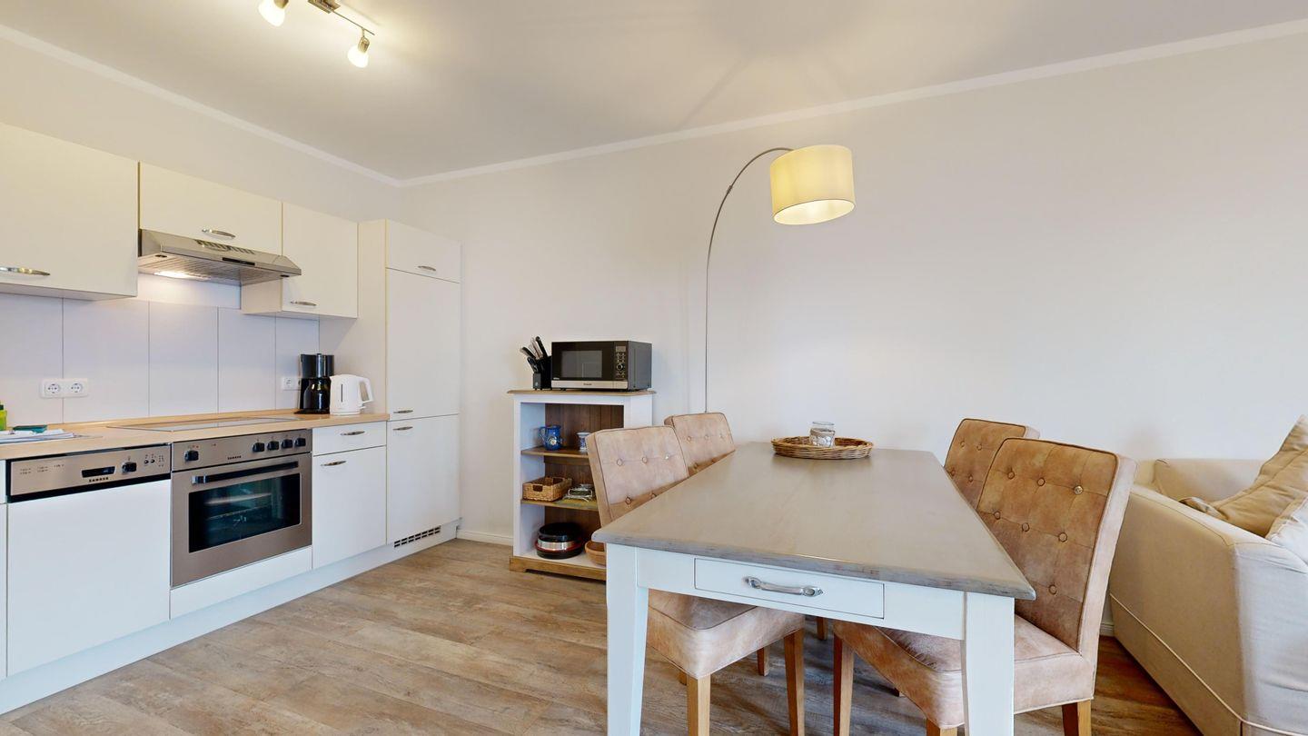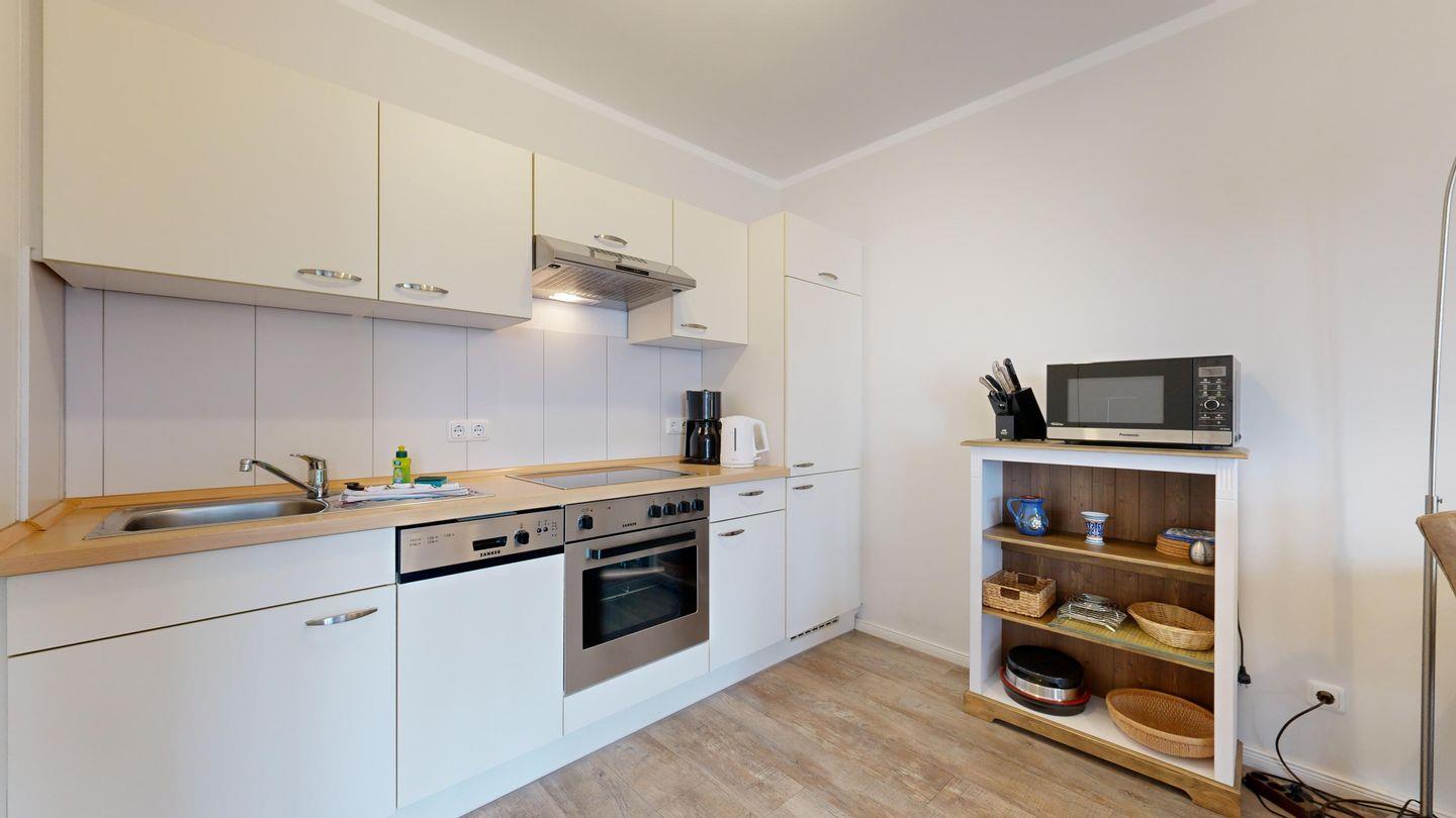 * Küche mit Ceranfeld, Kühlschrank mit Gefrierfach, Backofen, Spülmaschine, Toaster, Wasserkocher, Kaffeemaschine und Mikrowelle