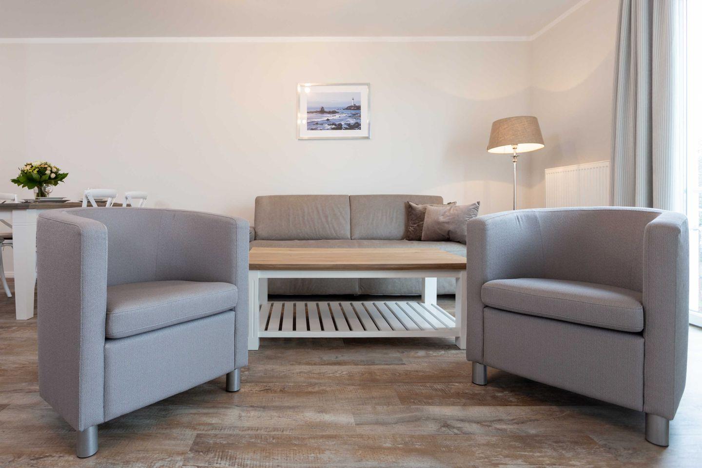 * Wohnzimmer mit Couchgarnitur (Schlafcouch für 2 Personen), Sessel, Flachbild-TV, Radio, Internetzugang (WLAN inkl.), Esstisch