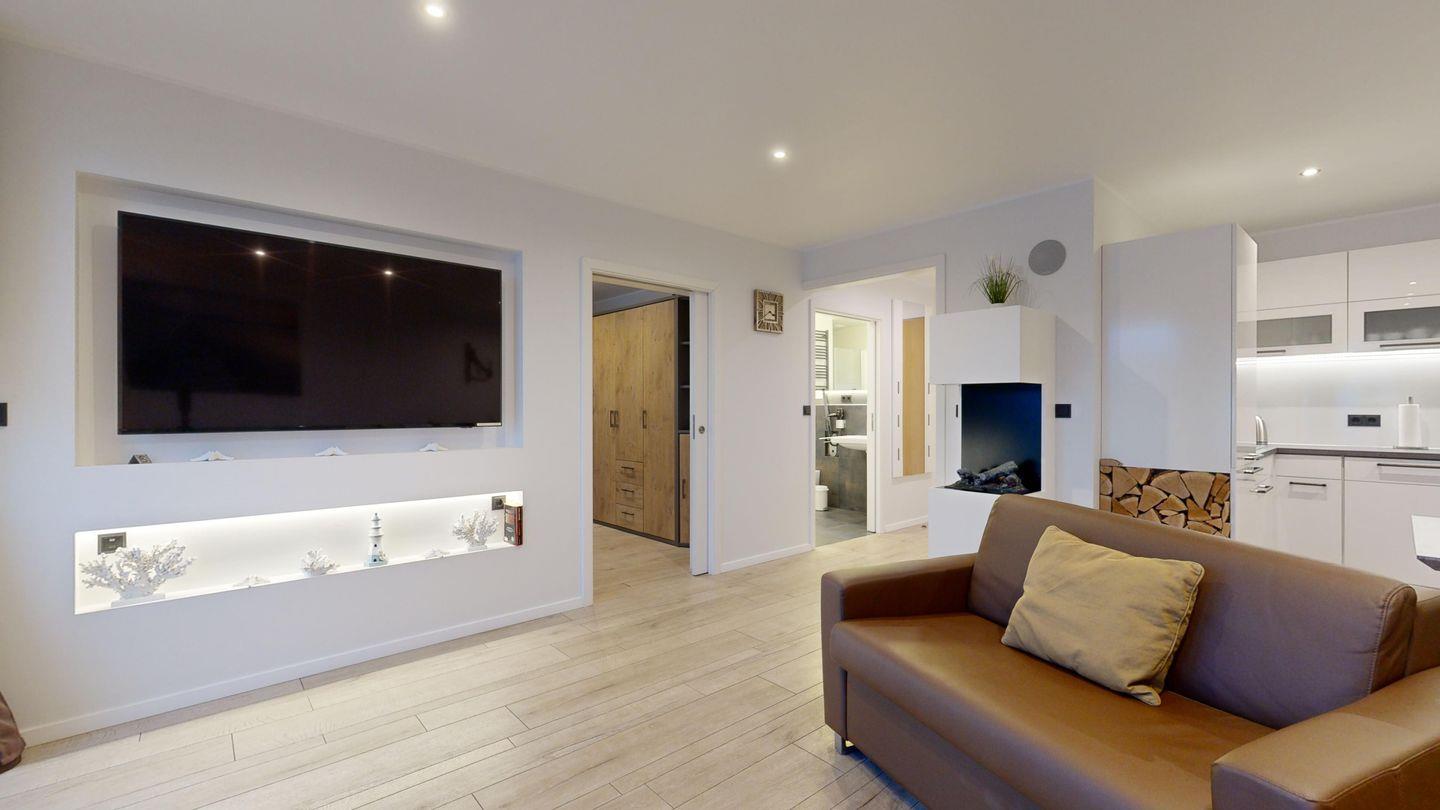 * Wohnzimmer mit großer Eck-Couchgarnitur (Schlafcouch für 2 Personen), Sessel, Flachbild-TV (65 Zoll), Radio, Internetzugang (WLAN inkl.), Esstisch