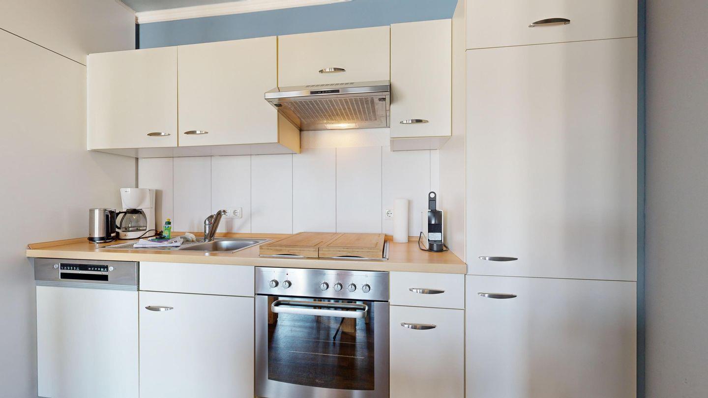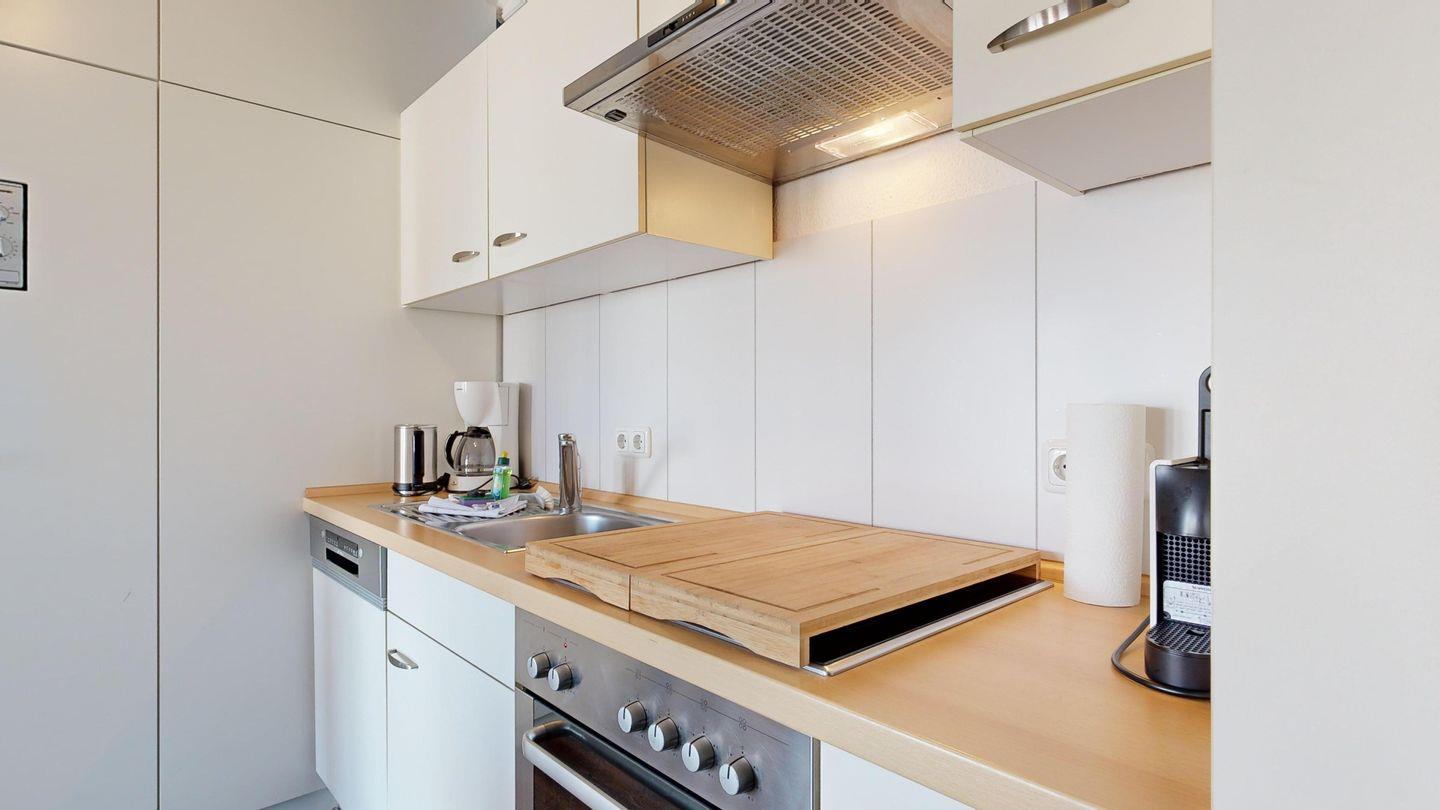 * Küche mit Ceranfeld, Kühlschrank mit Gefrierfach, Backofen, Spülmaschine, Kaffeemaschine und Nespresso-Maschine, Toaster, Wasserkocher und Mikrowelle