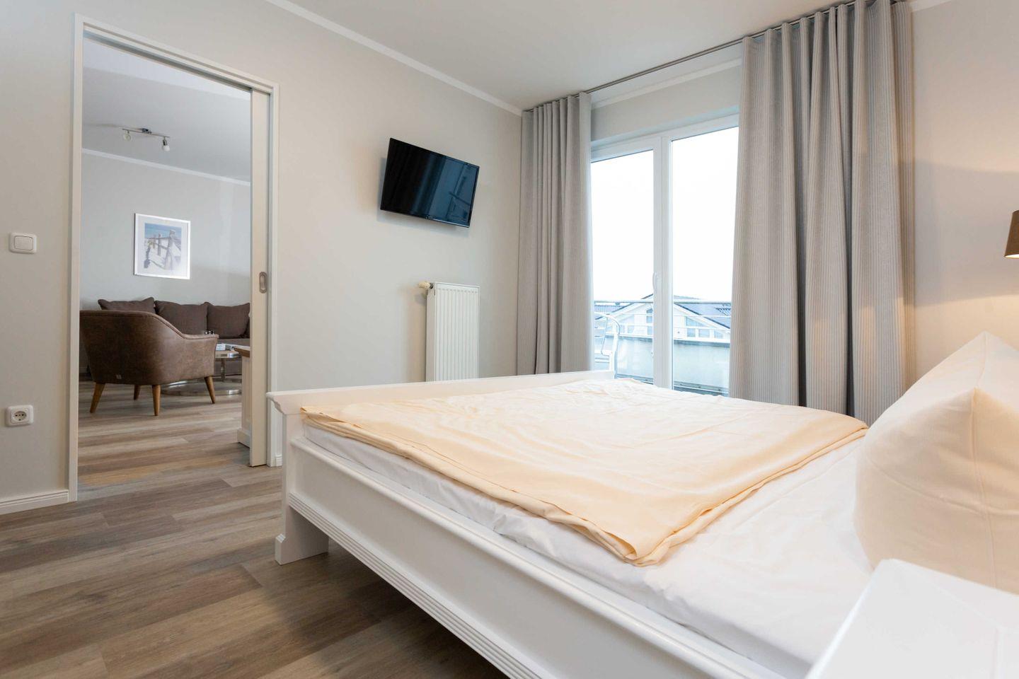 * 1 Schlafzimmer mit einem Doppelbett, Kleiderschrank und TV