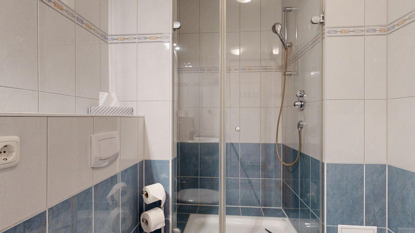 * Badezimmer mit großer Dusche, Föhn und WC
