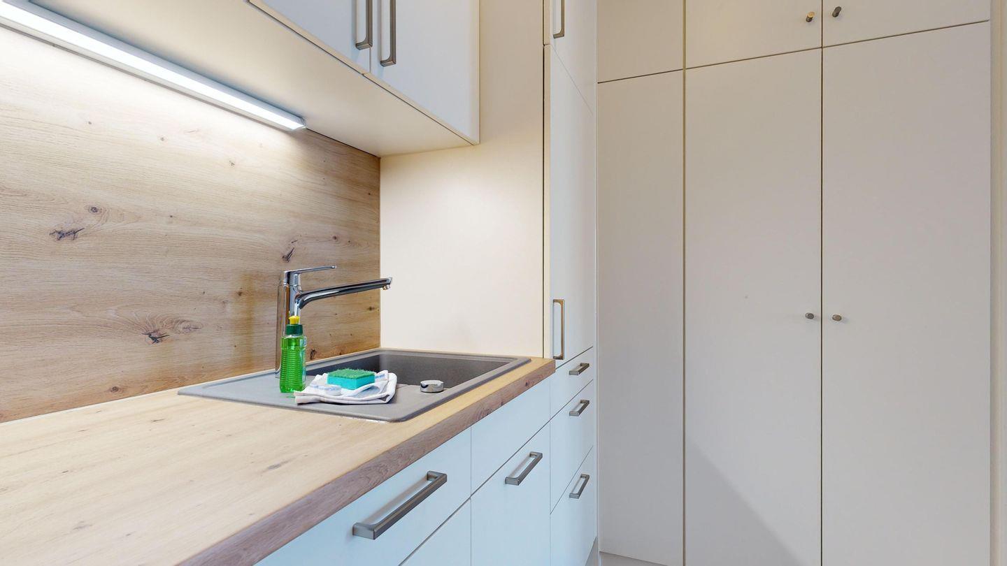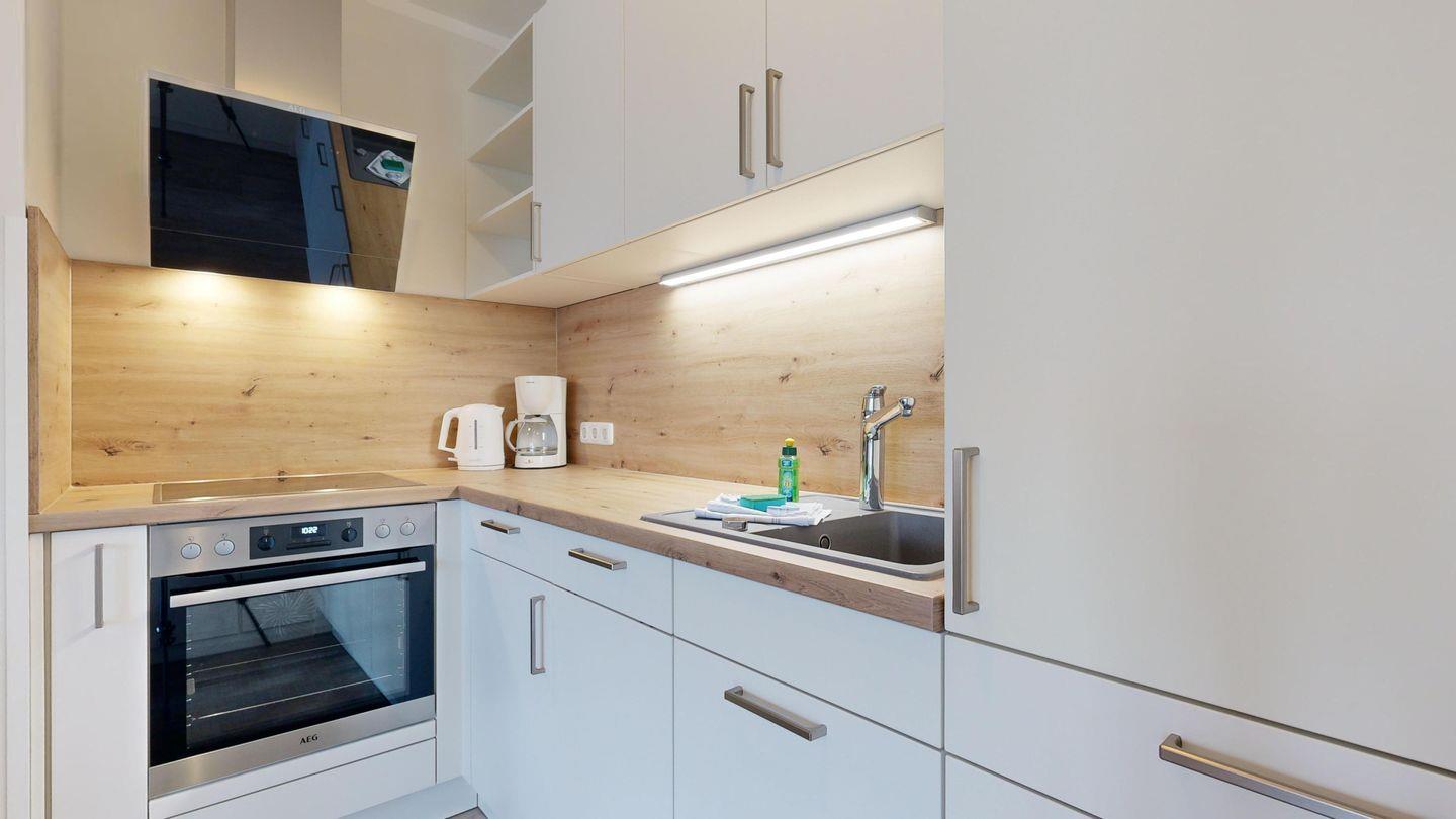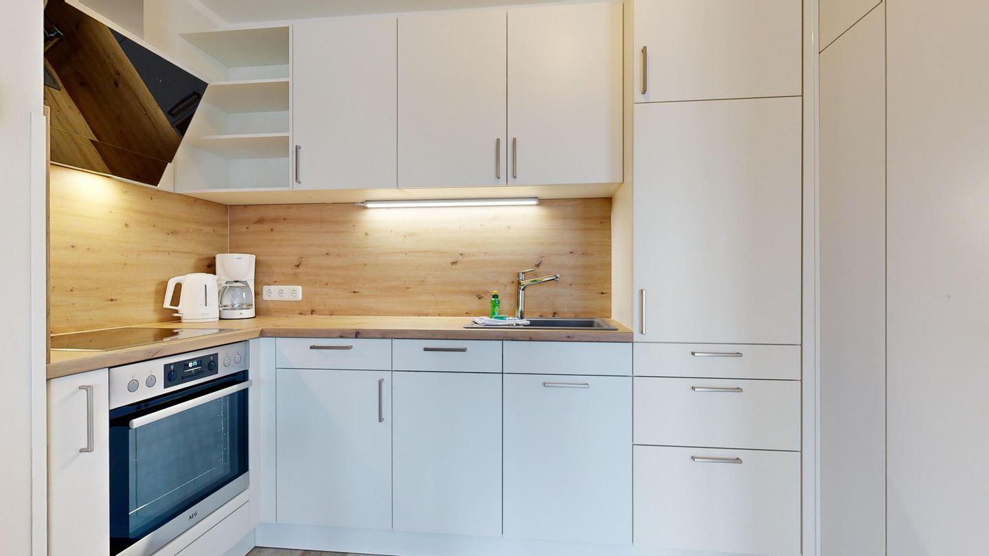 * Küche mit Induktionsfeld, Kühlschrank ohne Gefrierfach, Backofen, Spülmaschine, Toaster, Wasserkocher, Kaffeemaschine