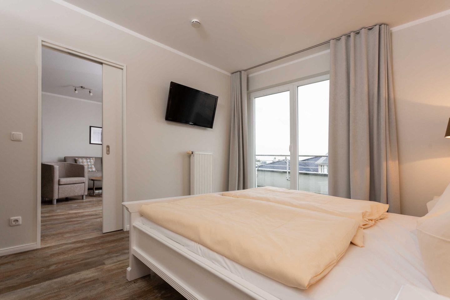 * 1 Schlafzimmer mit einem Doppelbett, Kleiderschrank und TV