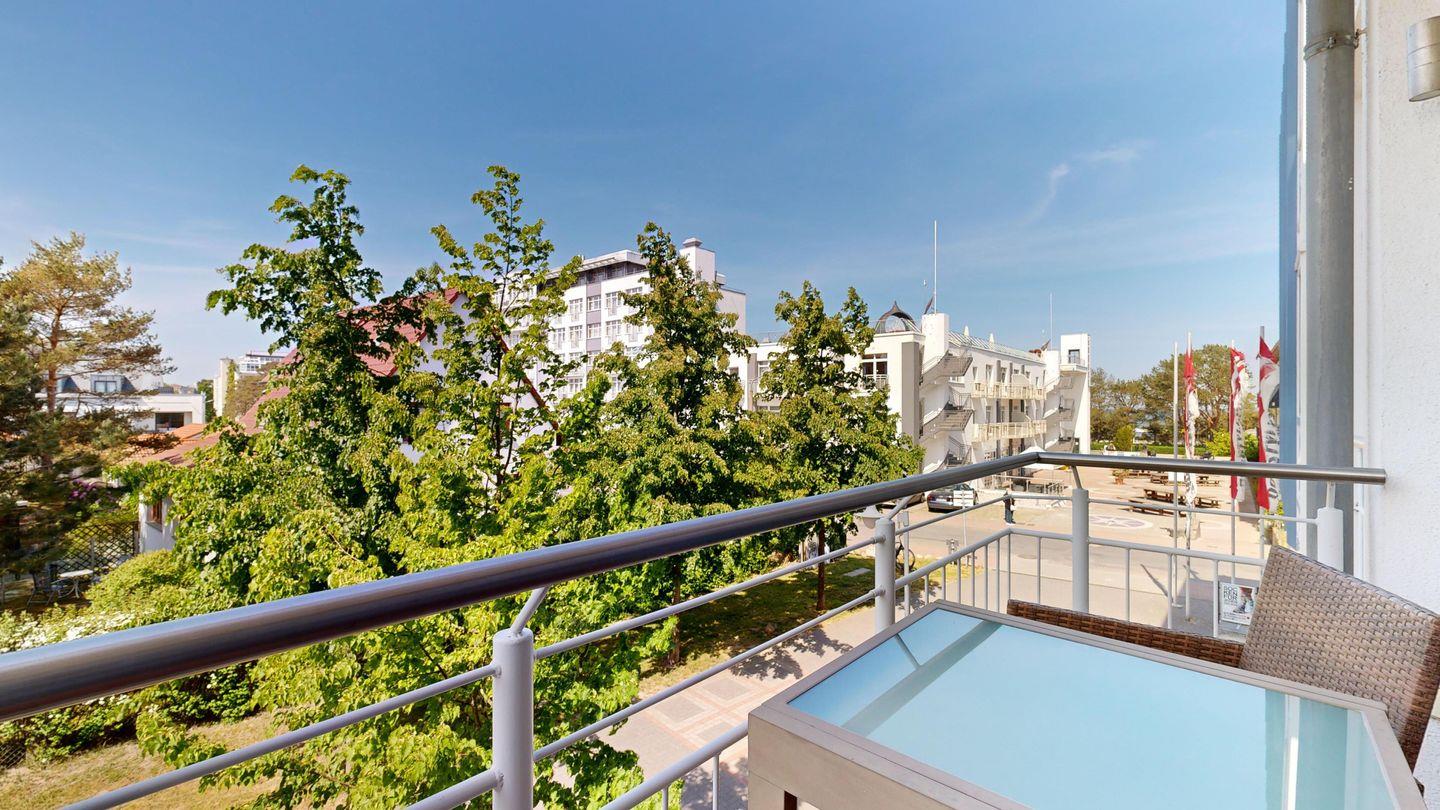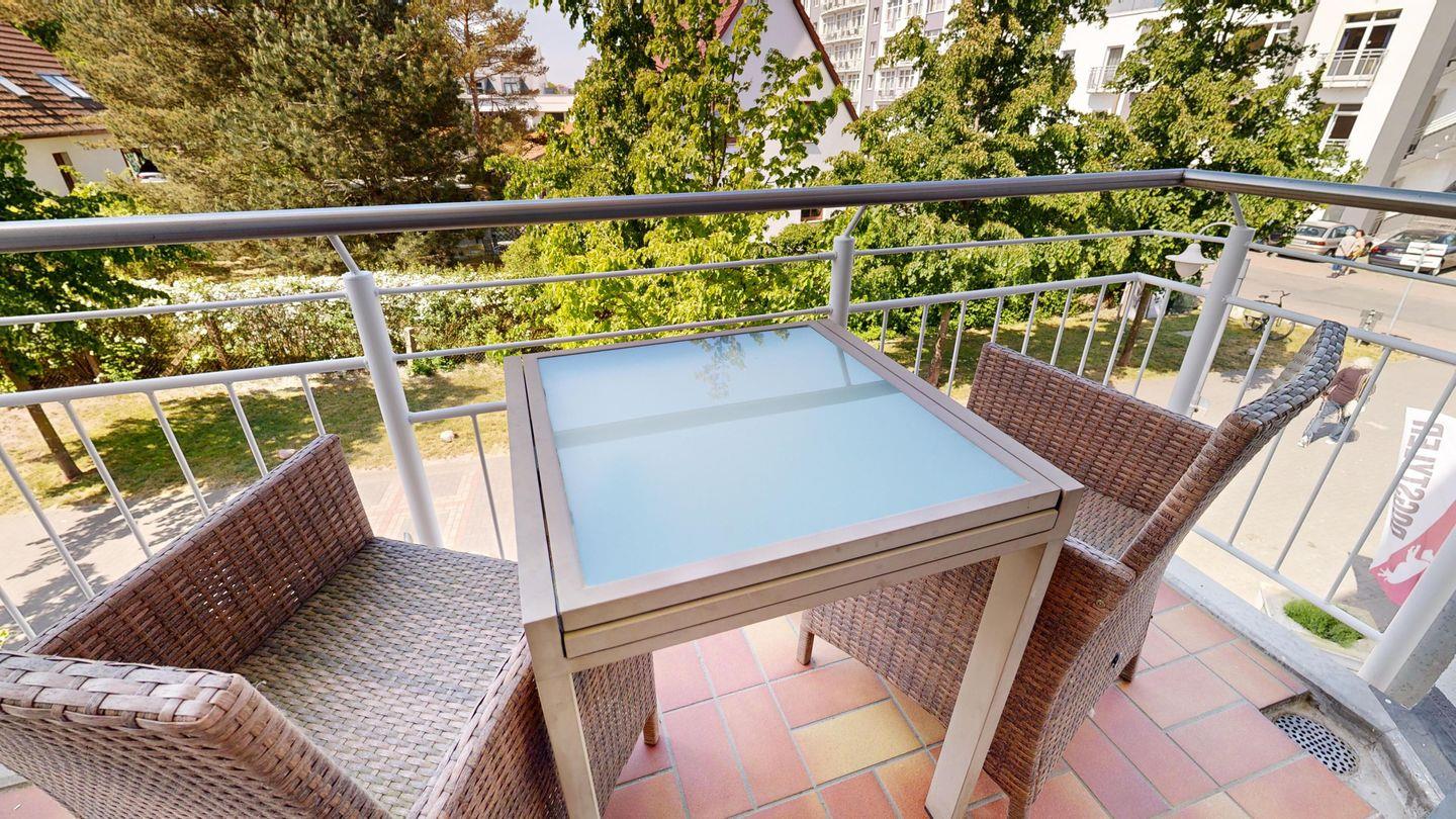 * Balkon mit Balkonmöbeln (Nordwest-Ausrichtung); vom Balkon haben Sie einen seitlichen Ostseeblick.