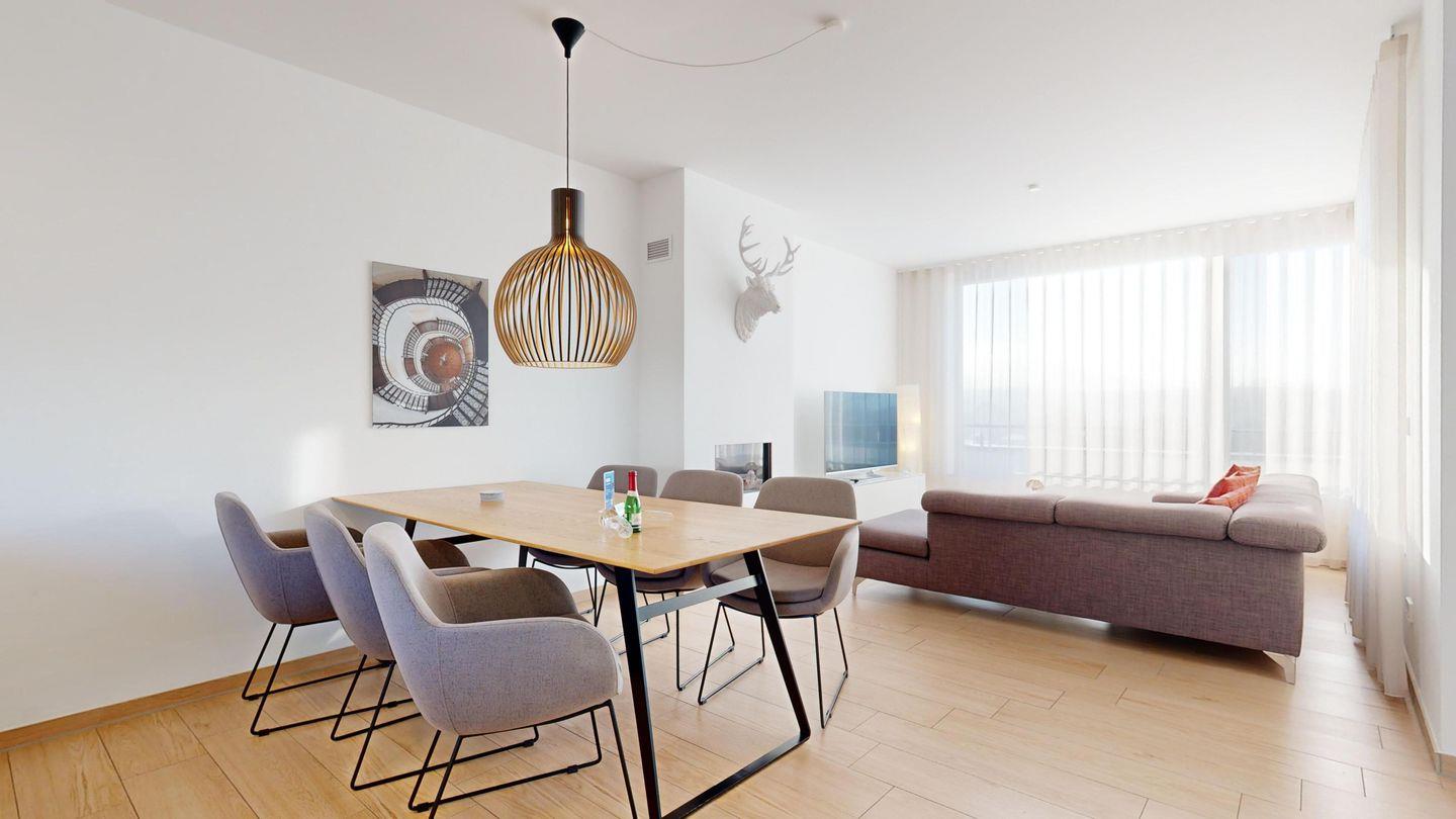 * Wohnzimmer: Sehr großer und lichtdurchfluteter Wohnbereich mit gemütliche große Eckcouchgarnitur, Kabel-TV (55 Zoll), großer Esstisch für 6 Personen, sehr große Fensterfront zum südlich ausgerichteten Balkon, großer Gaskamin mit Fernbedienung