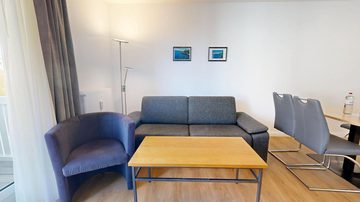 * Wohnzimmer: Couchgarnitur (Schlafgelegenheit für 2 Personen), Kabel-TV, Stereoanlage, Internetanschluss (WLAN), Esstisch