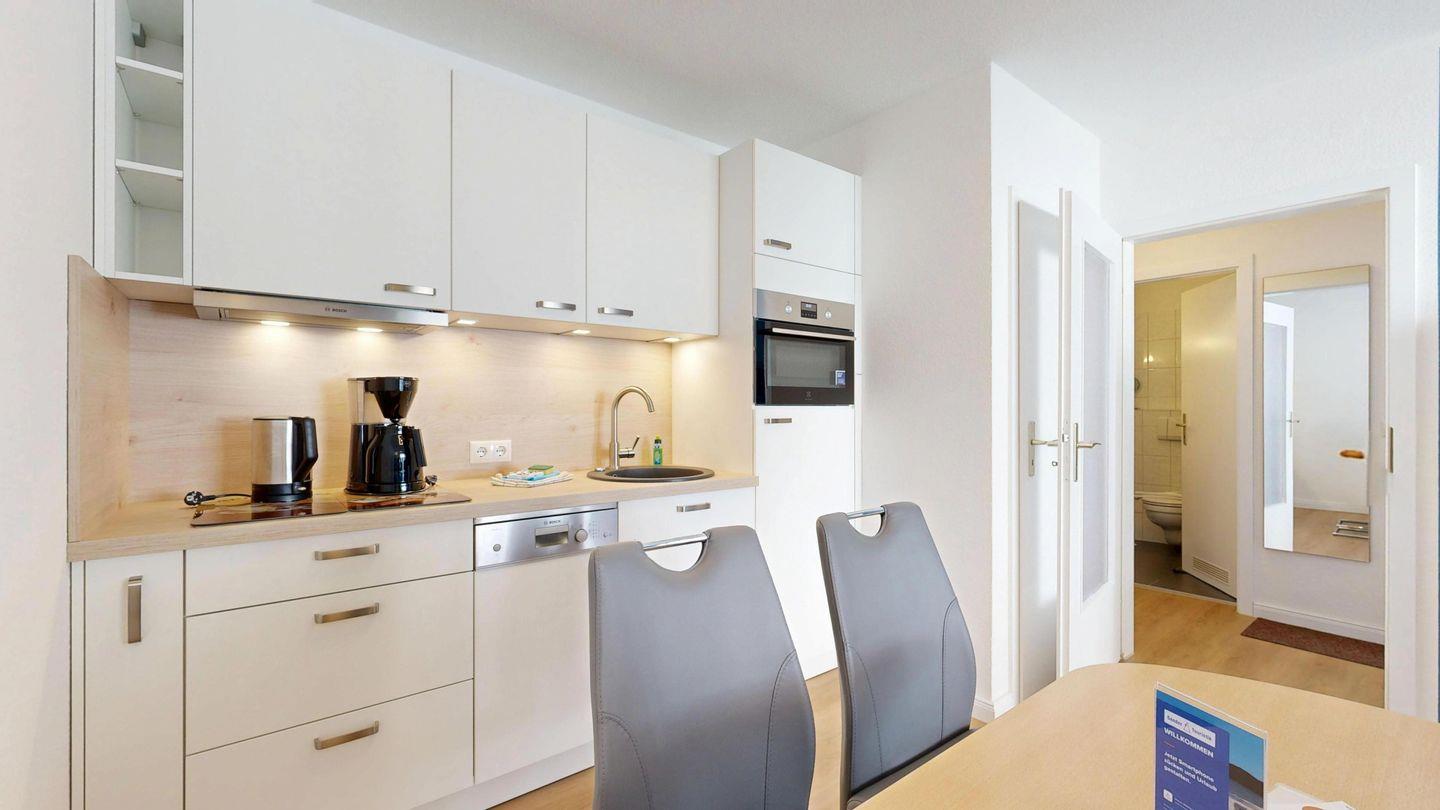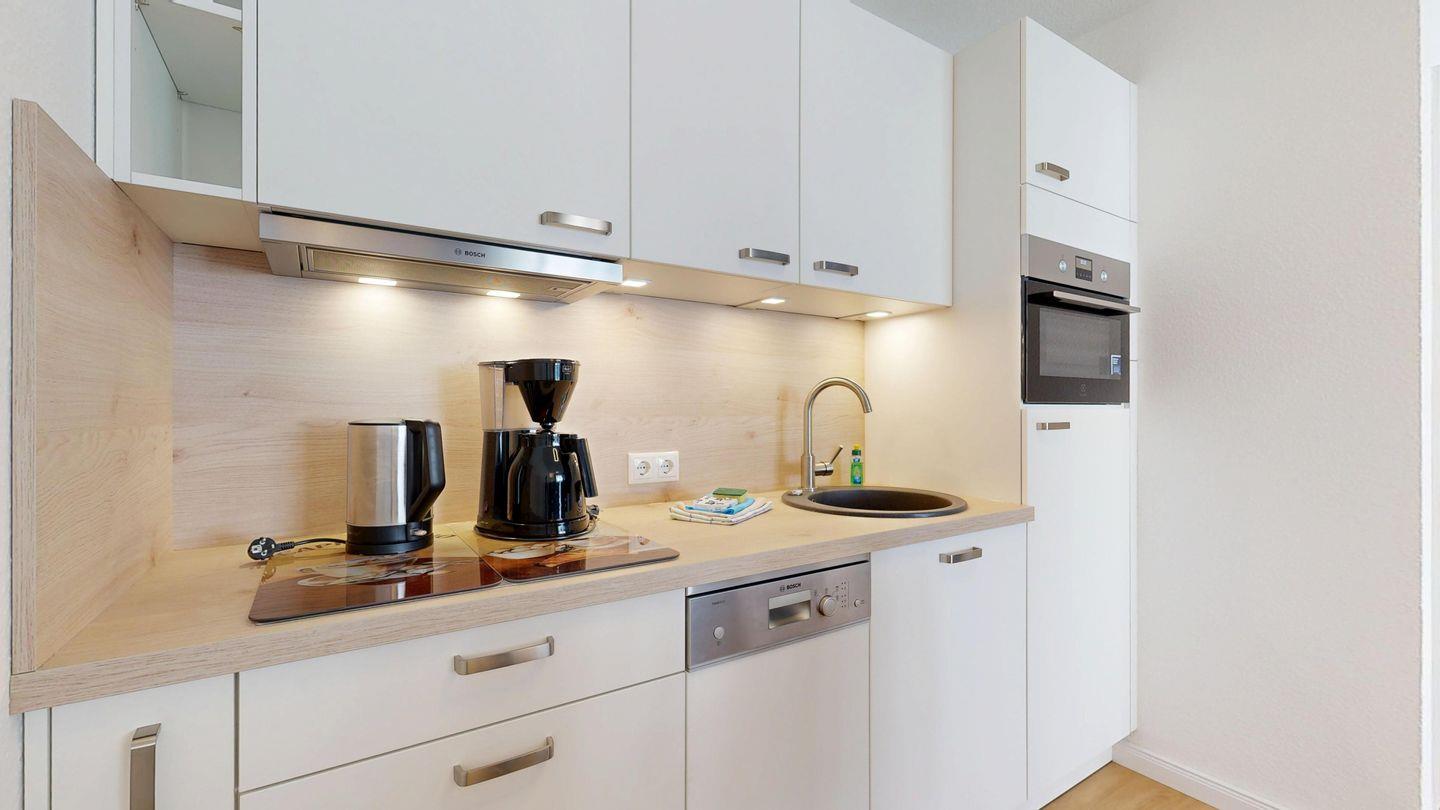 * Küchenzeile mit Spülmaschine, Ceranfeld, Mikrowelle mit Backofen, Kaffeemaschine, Toaster und Kühlschrank mit Gefrierfach