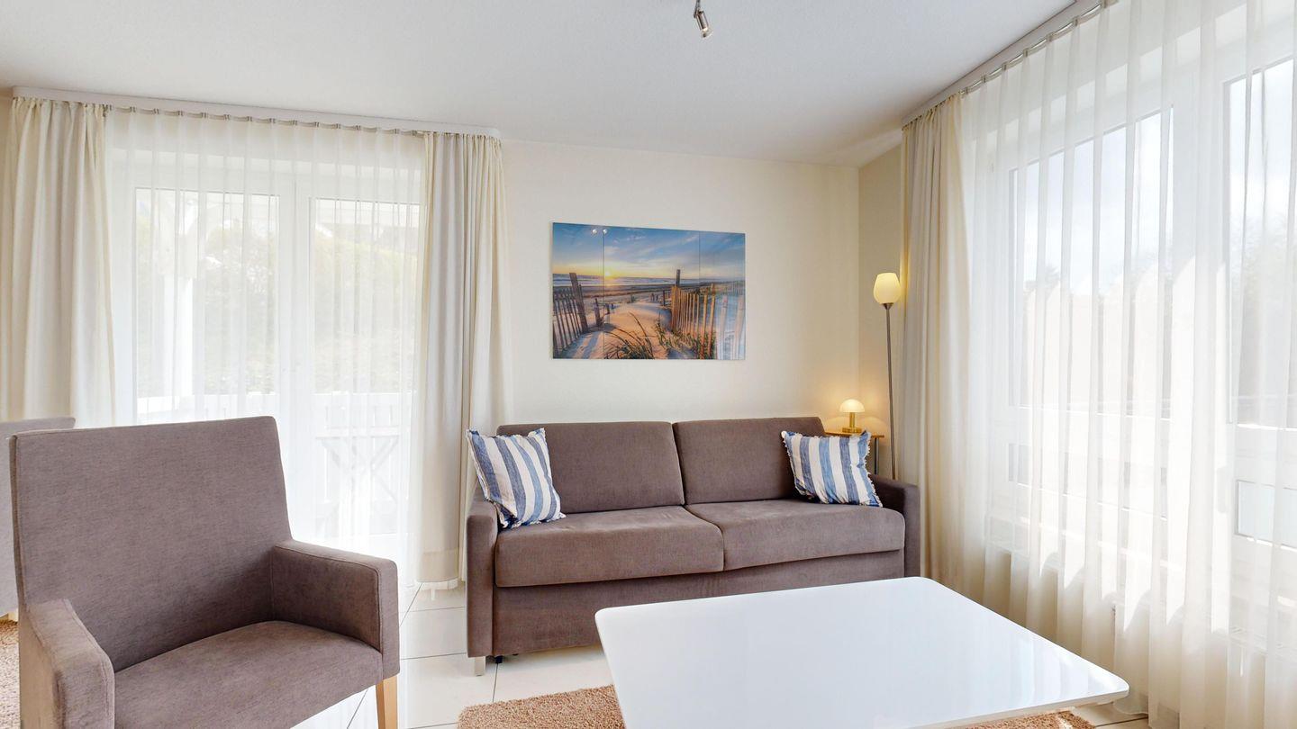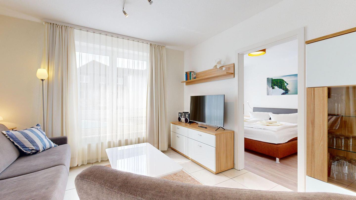 * Wohnzimmer: Couchgarnitur (Schlafgelegenheit für 2 Personen), Kabel-TV, Stereoanlage, Internetanschluss-WLAN, Esstisch