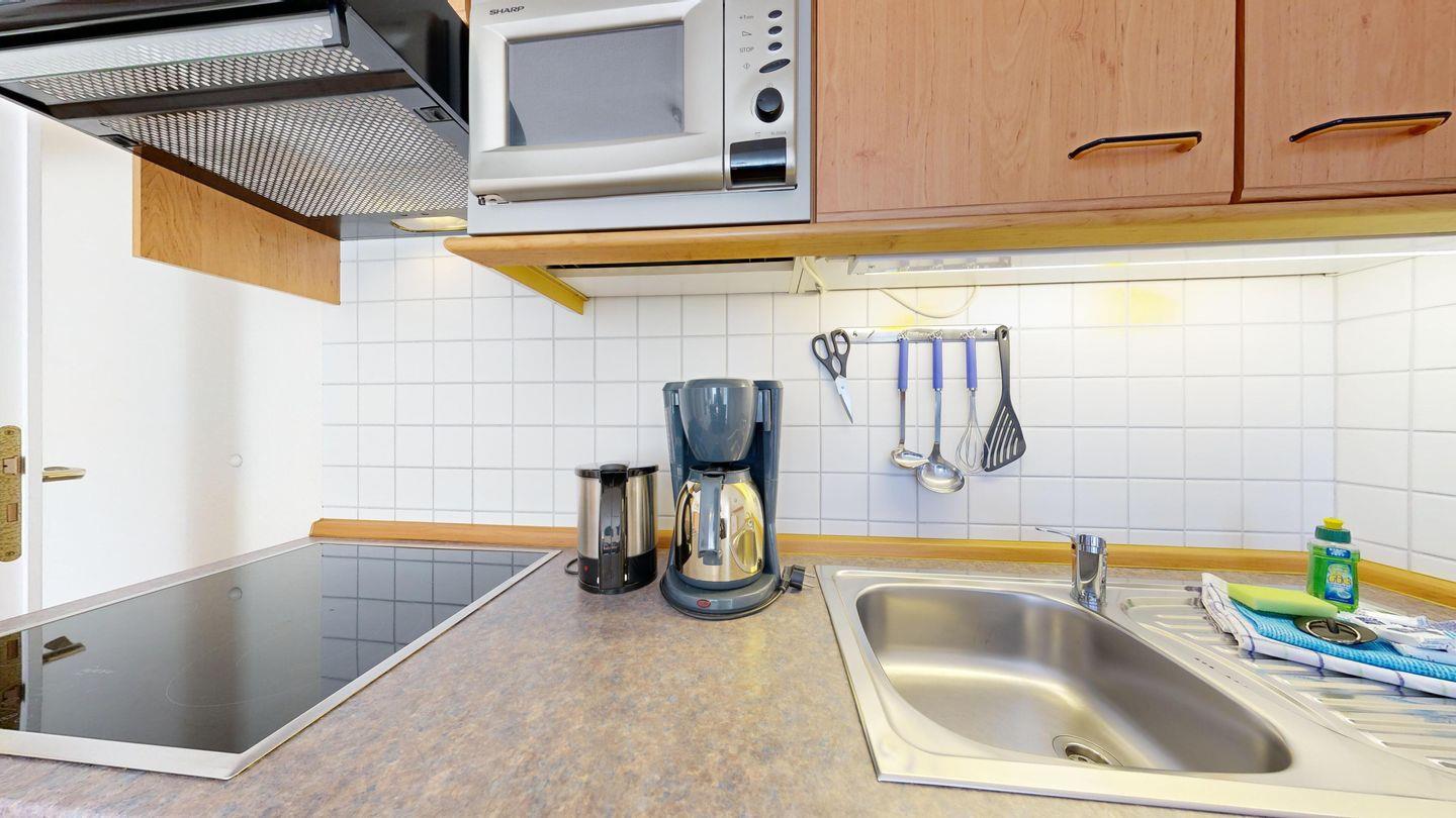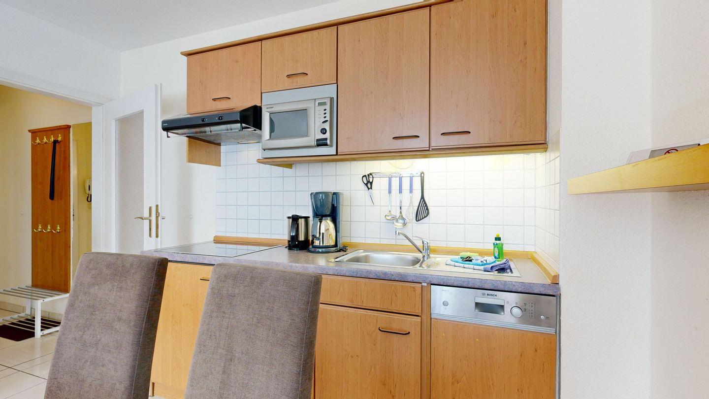 * Küchenzeile mit Spülmaschine, Ceranfeld, Mikrowelle, Kaffeemaschine, Toaster und Kühlschrank mit Gefrierfach