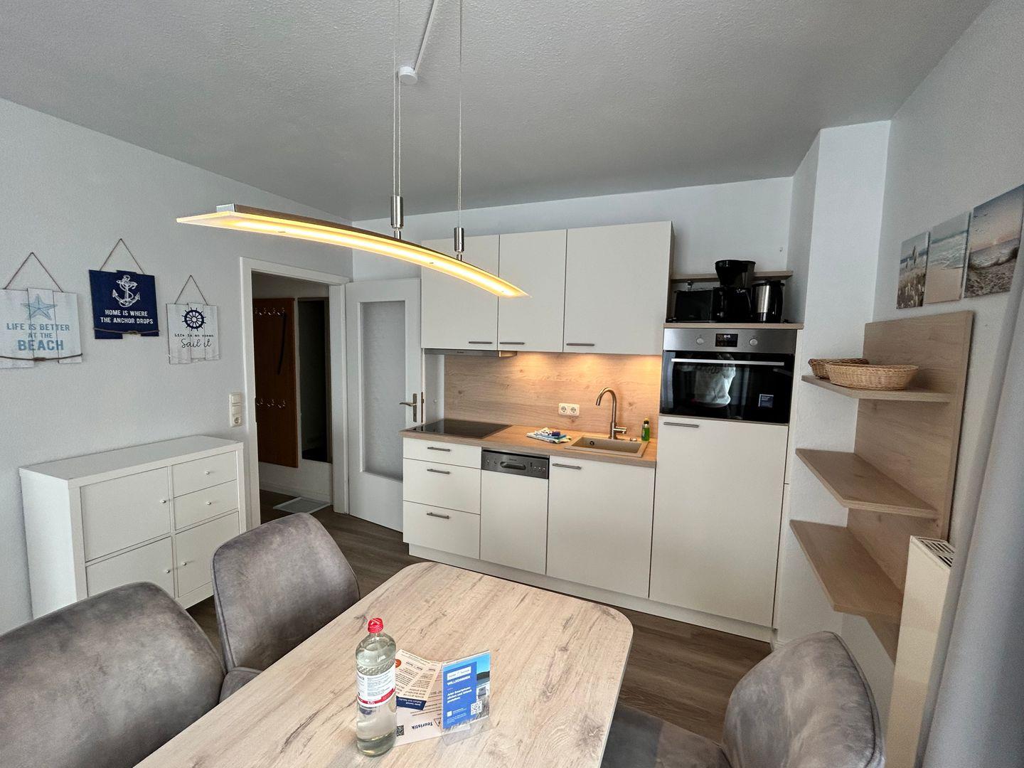 * Küchenzeile mit Spülmaschine, Ceranfeld, Mikrowelle, Kaffeemaschine, Toaster und Kühlschrank mit Gefrierfach