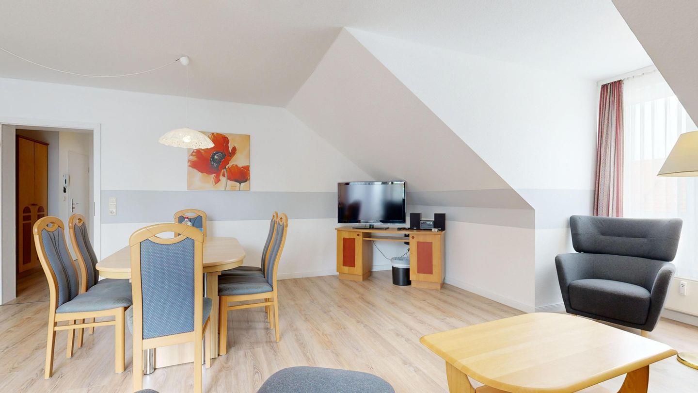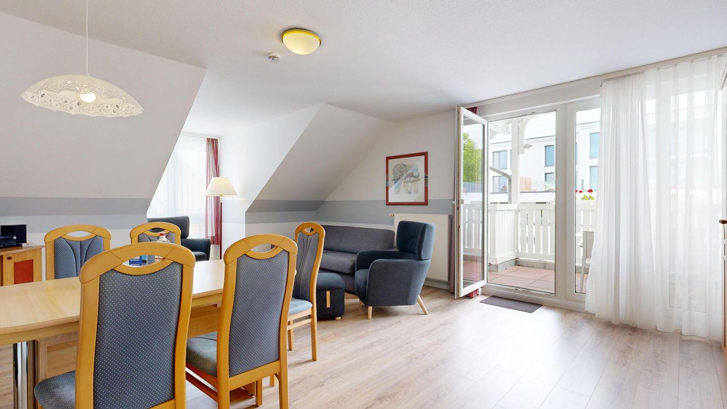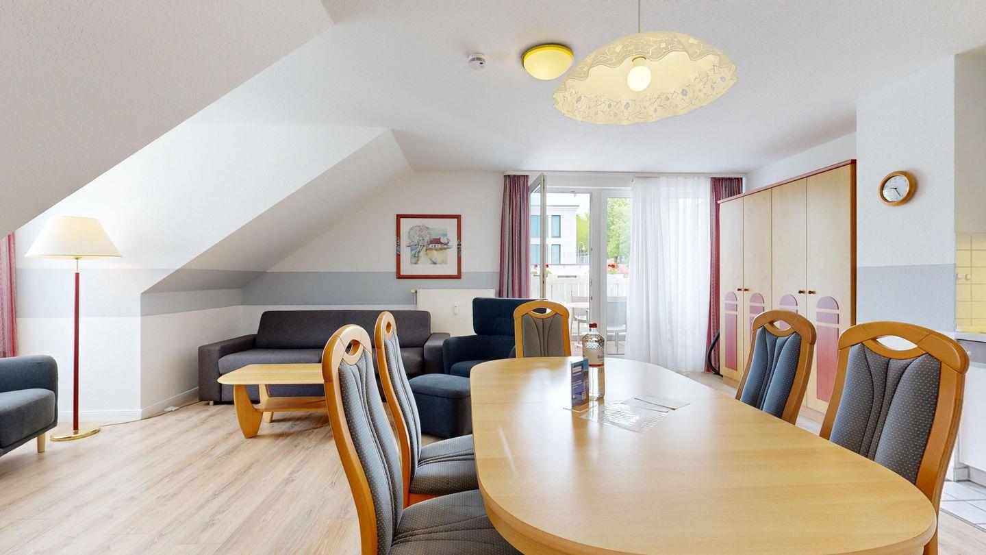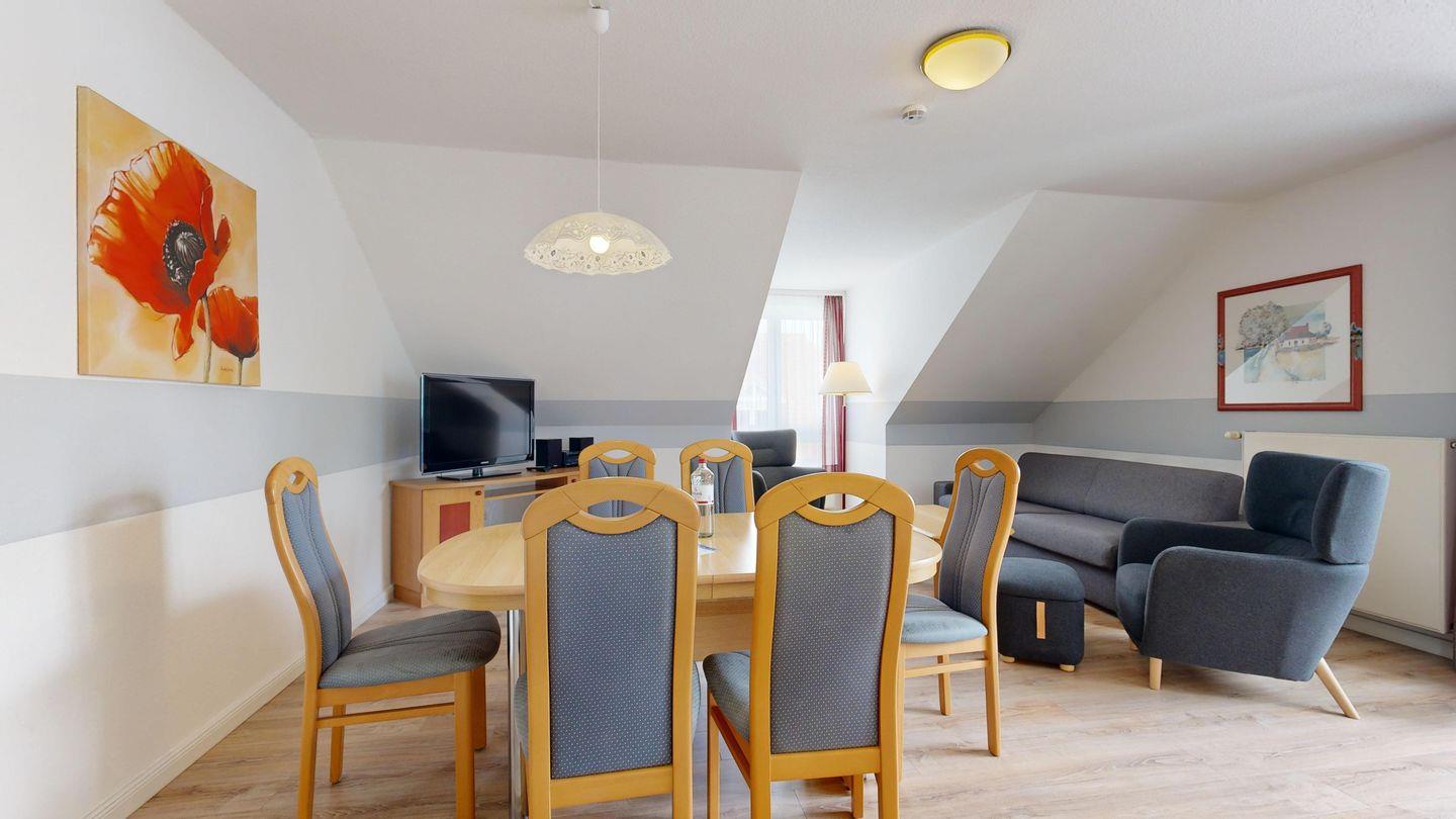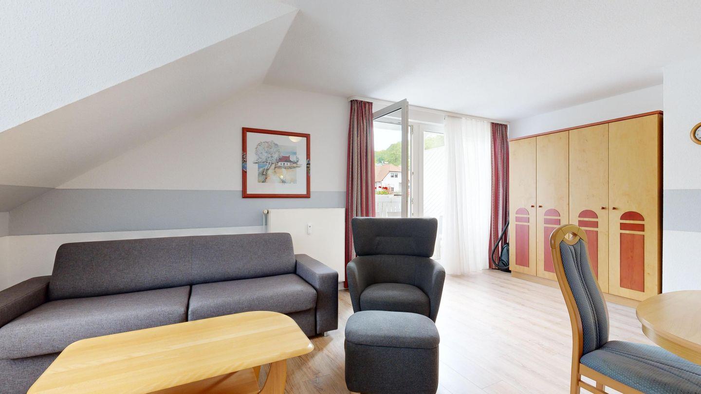 * Wohnzimmer: Couchgarnitur (Schlafgelegenheit für 2 Personen), Kabel-TV, Stereoanlage, Internetanschluss (WLAN), Esstisch