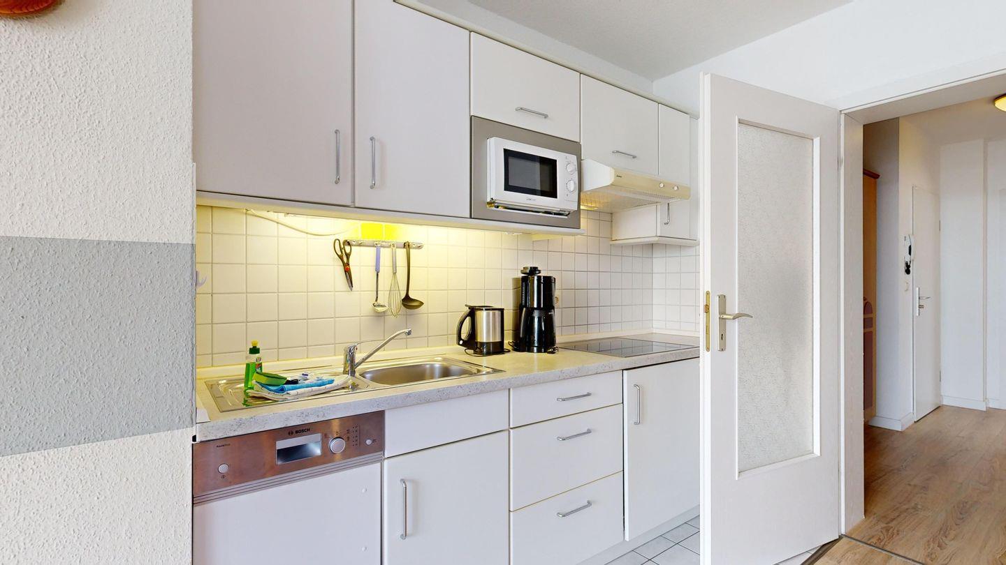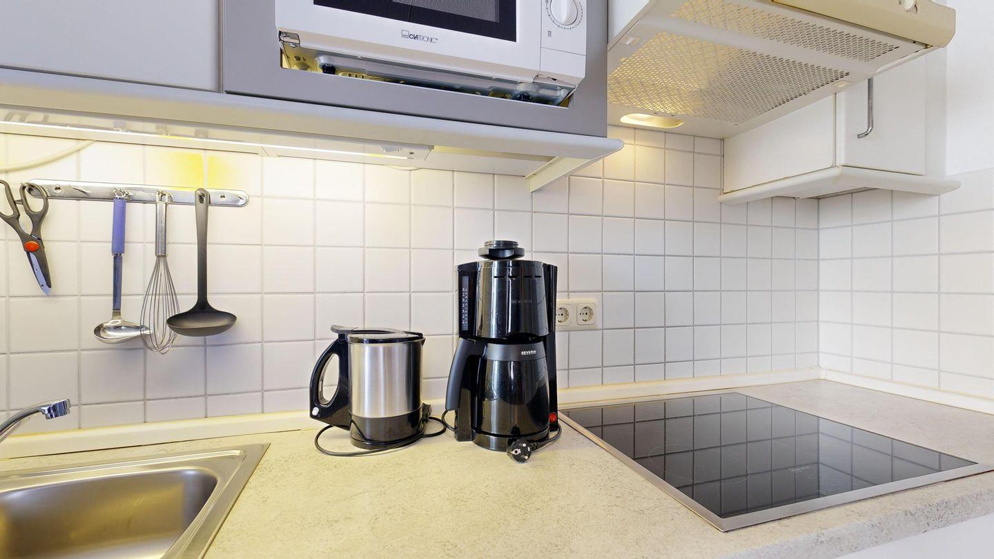 * Küchenzeile mit Spülmaschine, Ceranfeld, Mikrowelle, Kaffeemaschine, Toaster und Kühlschrank mit Gefrierfach