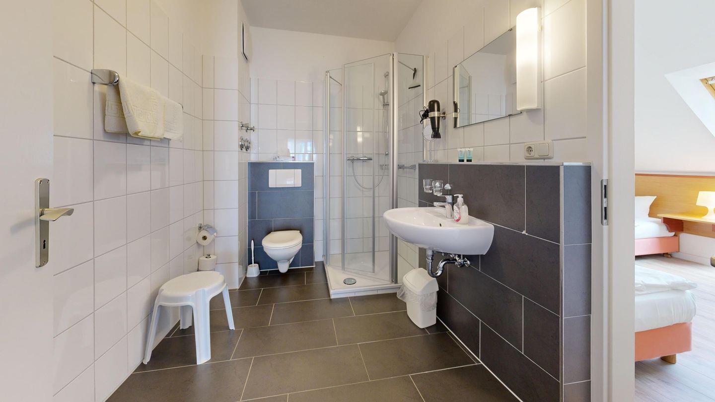 * Dusche (Tiefeinsteiger), WC, Haartrockner