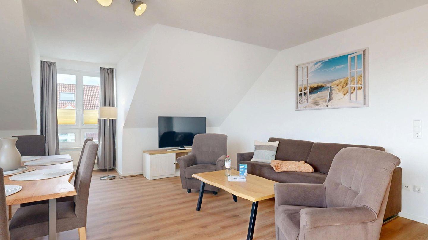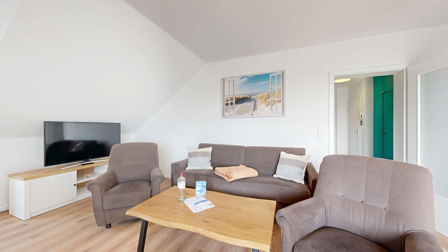 * Wohnzimmer: Couchgarnitur (Schlafgelegenheit für 2 Personen), Kabel-TV, Stereoanlage, Internetanschluss (WLAN), Esstisch